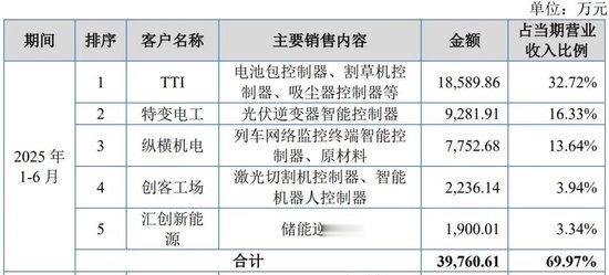 不过拓普泰克也由此对大客户存在较大依赖,2022年—2024年及2025年上半年,公司来自前五大客户的销售收入占比分别为57.95%、61.11%、67.19%和69.97%,客户集中度逐年走高。
