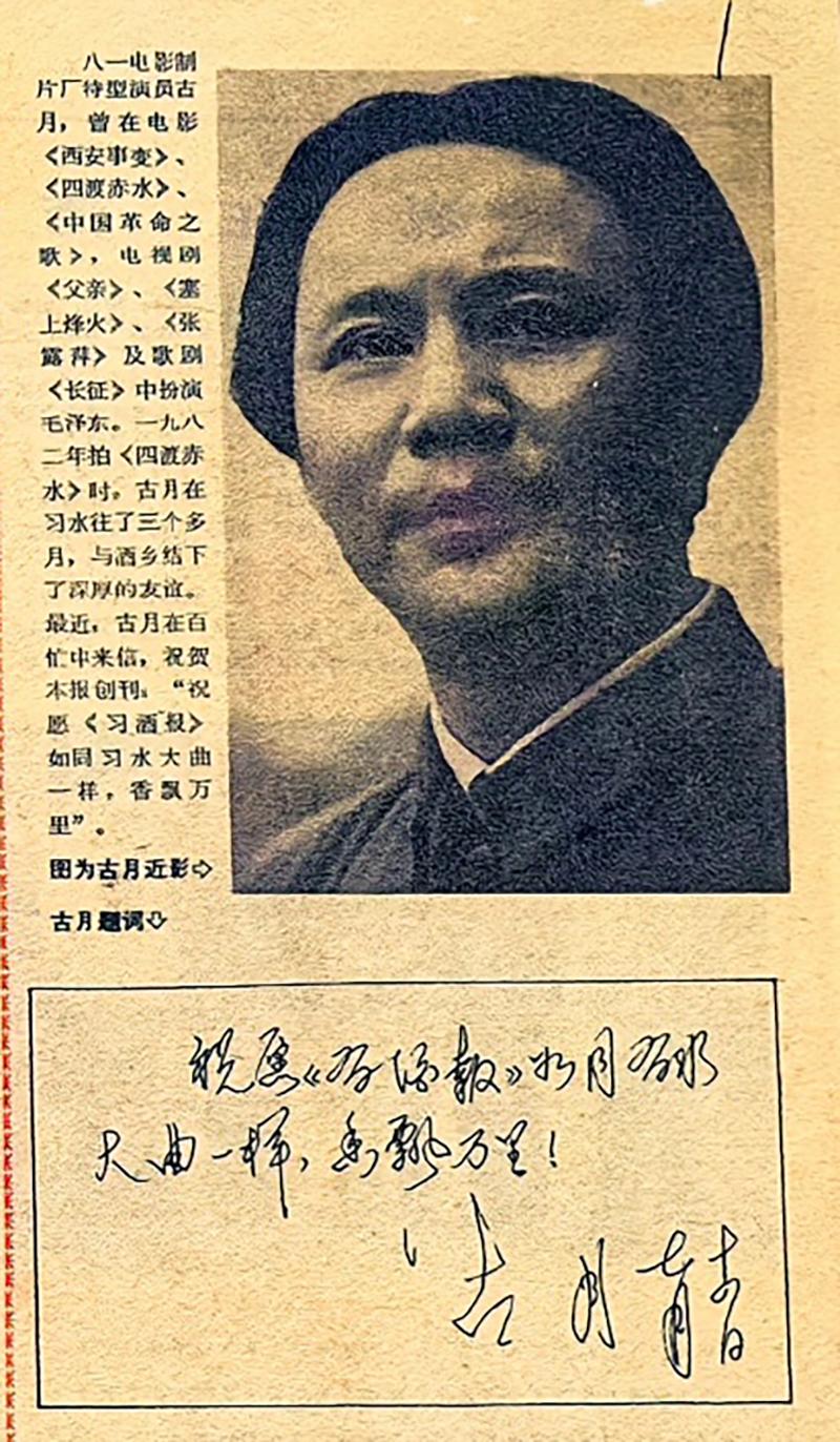 1985年时的一张习酒集团创办的《习酒报》创刊号,饰演毛主席的古月的题词被排在了前人大副委员长王任重的前面,那时候离毛主席逝世才9年,可见全民怀念之情。当年的古月确实是形神兼备,至今无出其右者。 另外,古月的硬笔书法也是相当不错的,飘逸秀美,颇有些功力。