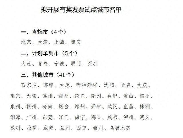 商务部、财政部、国家税务总局1月23日对外公示拟开展有奖发票试点城市名单,包括长春等50个城市入选。