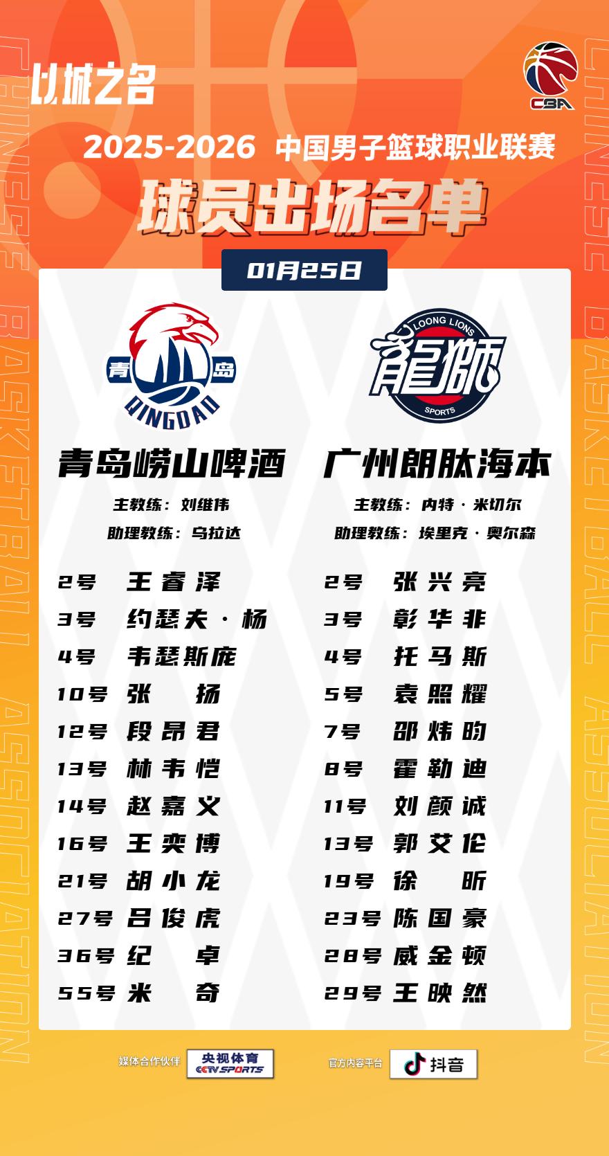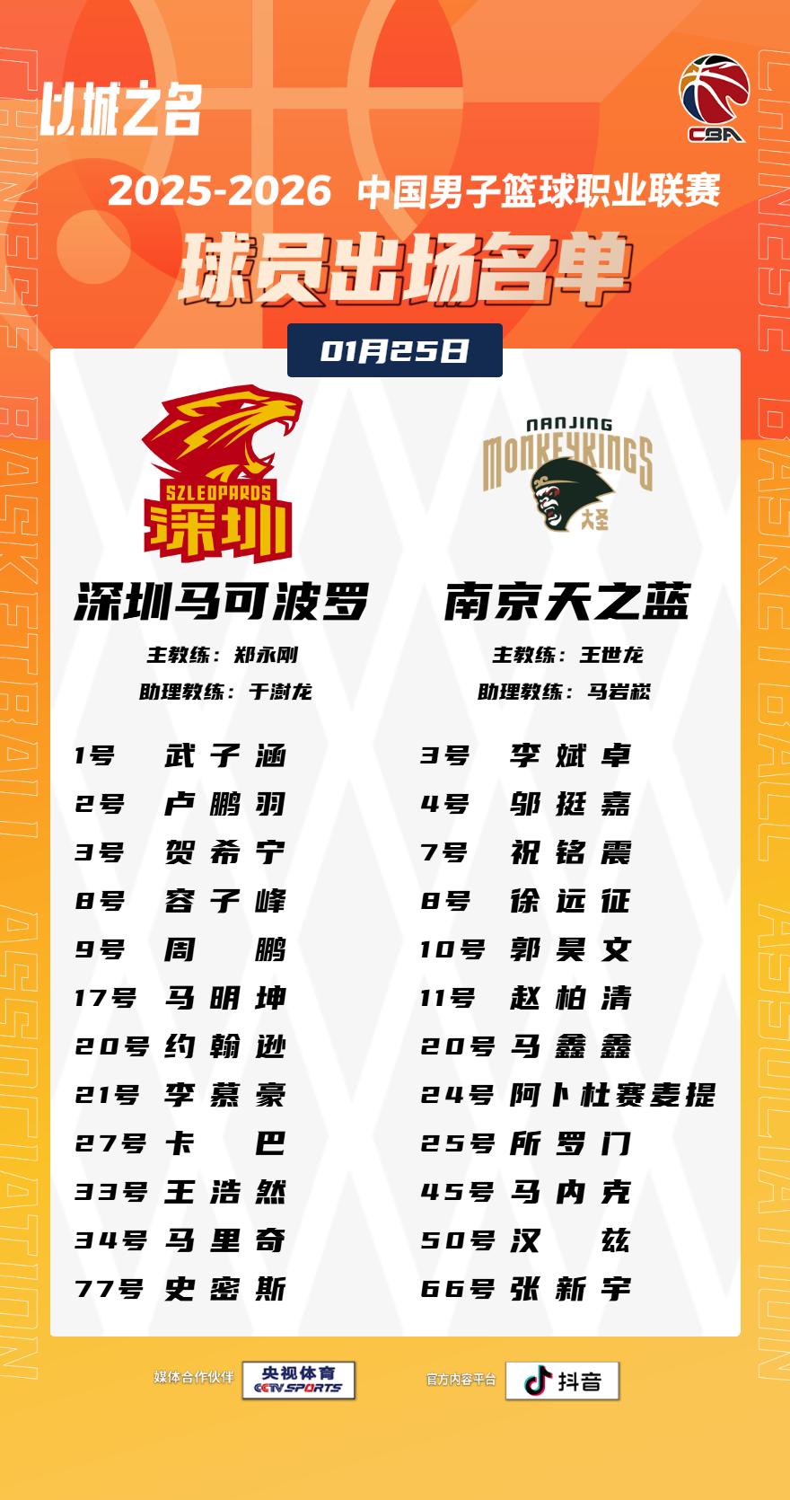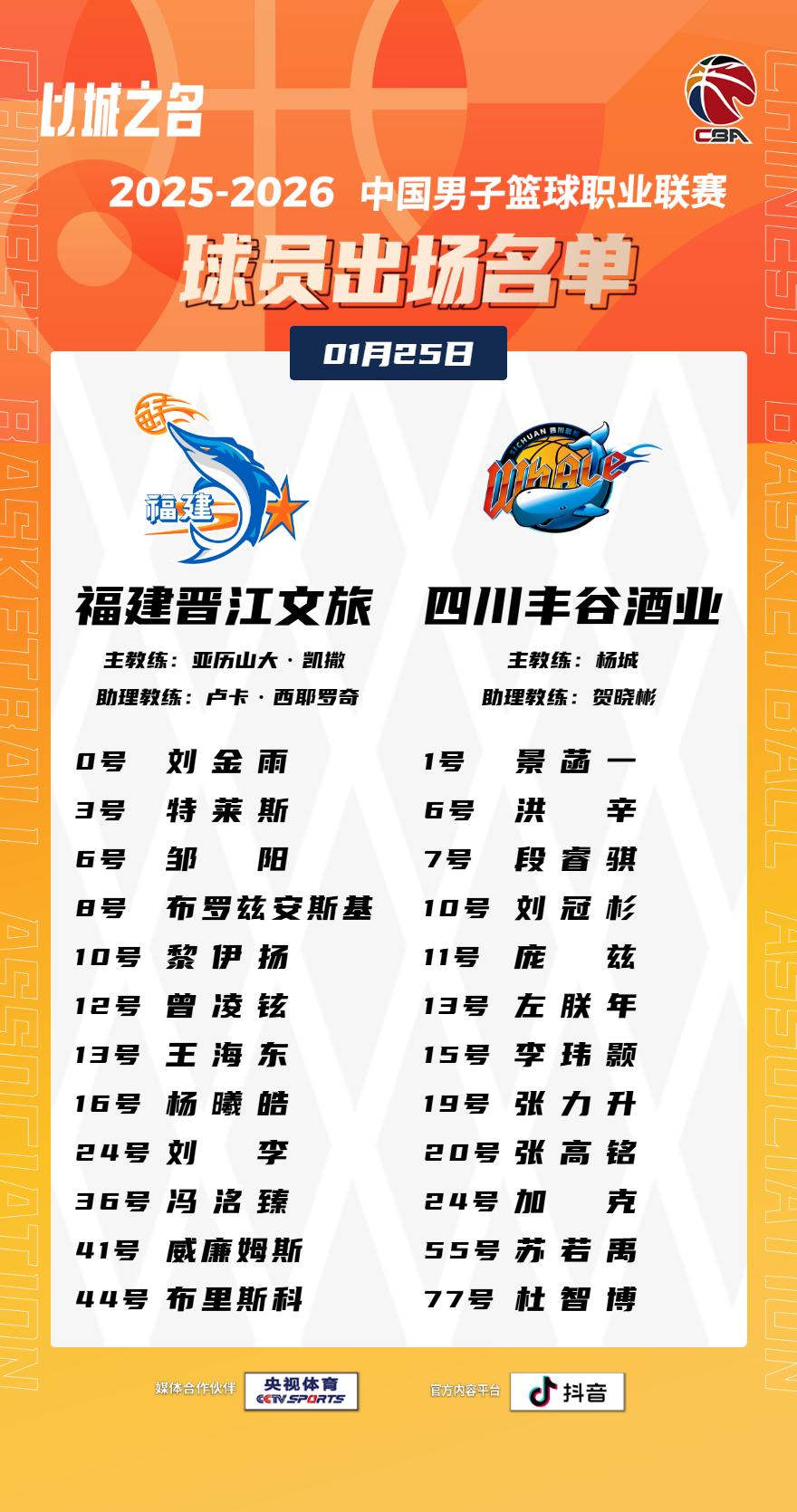 【大名单出炉】2025-2026赛季CBA联赛常规赛第十九轮今晚继续进行,6场比