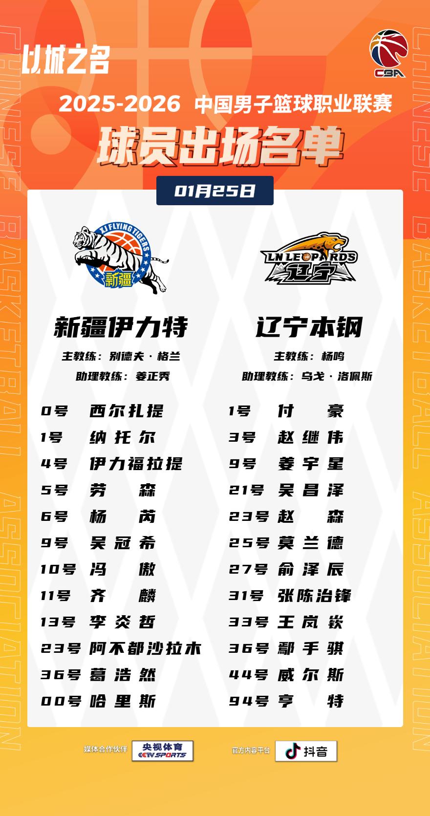 【大名单出炉】2025-2026赛季CBA联赛常规赛第十九轮今晚继续进行,6场比赛将在19:35同时跳球,新疆伊力特vs辽宁本钢将在20:00跳球,敬请期待!CBA联赛 以城之名