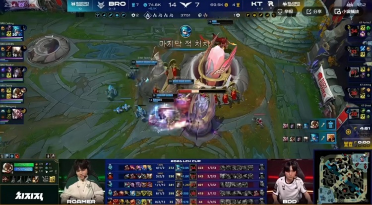 比赛进入中期,22分钟BRO再抢第四条小龙,25分钟KT开大龙,BRO一看打野没闪直接不要了!反手拆掉了KT的中一塔!28分钟BRO再拿一条小龙,拉扯局Roamer发条转三个但是没有后续伤害,Ghost布隆大招留人效果很好!配合上了R闪的赵信!Bdd沙皇打死不推,沙兵猛戳补充输出!这波KT打出1换2!反超经济!
