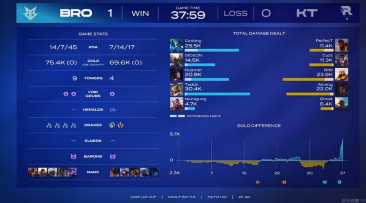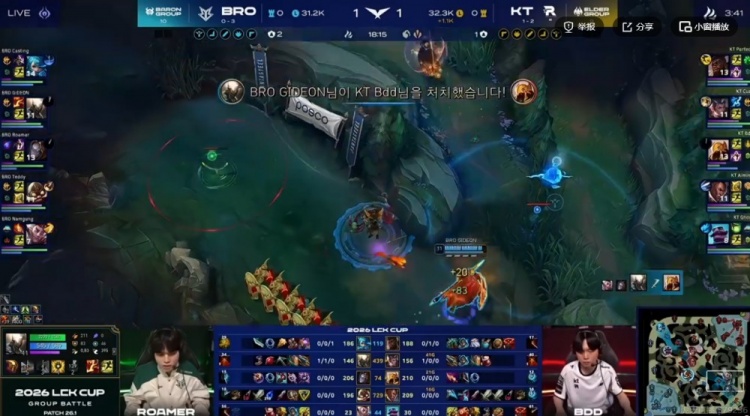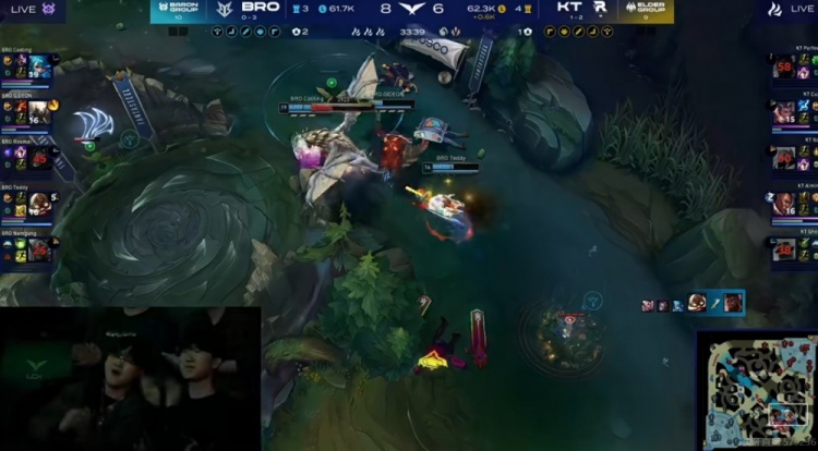 33分钟龙魂团KT野辅大招击飞两个+Bdd沙皇退三个但是没赢下团!Teddy库奇隔墙输出拉满!这波最终还是潘森复活甲优势,BRO拿下风龙魂之后转上Casting格温和Cuzz赵信互换,BRO再拿大龙!经济又BRO反超了回来!
