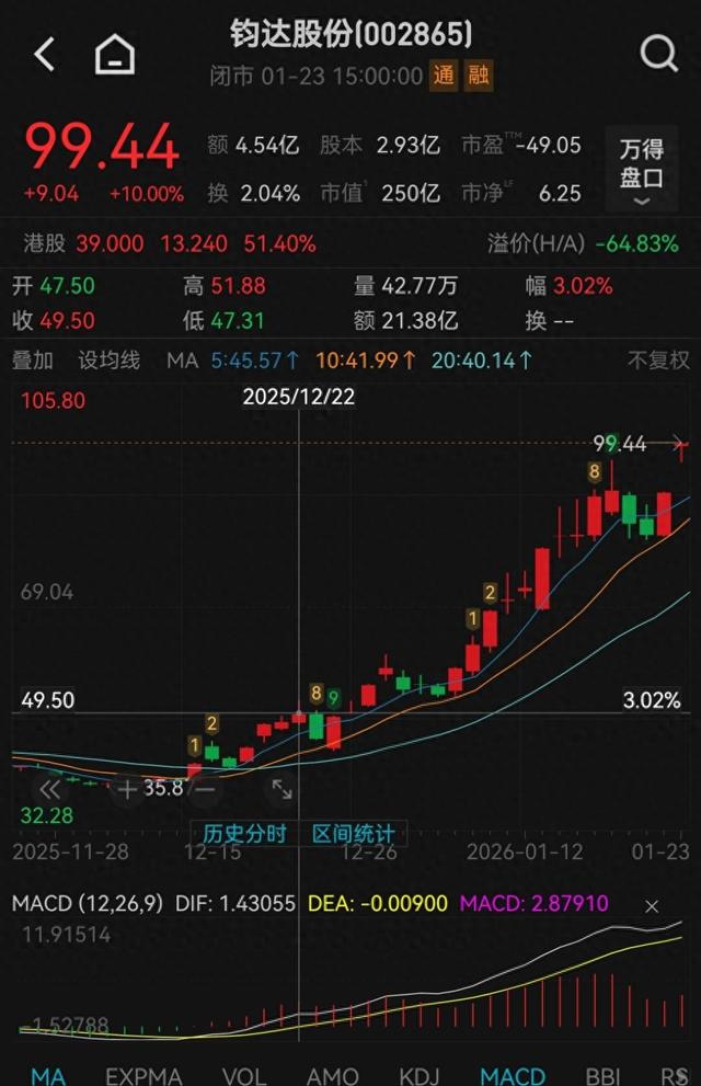 此前,钧达股份于2025年12月22日通过线上电话会议披露布局“太空光伏”赛道。在此期间,钧达股份股价收获多个涨停板,月内累计上涨约101%。截至2026年1月23日,钧达股份股价再度涨停,报收99.44元/股。