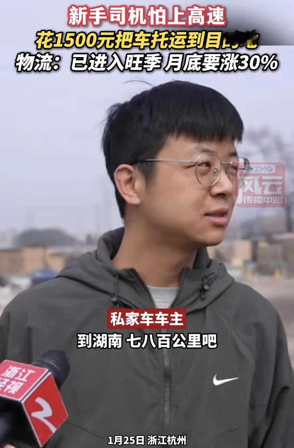 浙江杭州一新手司机因为害怕上高速,选择了通过托运把小车托运回老家,1500块钱可以运送到七八百公里的老家,平均下来1块5毛钱1公里,像这种托运车辆一天能运出40吧,一般发往北的地方价格会便宜,而发往南的地方就会偏贵一点,进入旺季,价格还会往上涨,对于很多新手司机来说,技术不好,又遇上特别的天气的话,即使上高路,高速公路还会有一定的危险。