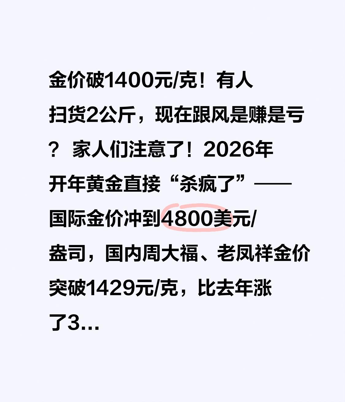 金价破1400元/克!有人扫货2公斤,现在跟风是赚是亏? 家人们注意了!2026年开年黄金直接“杀疯了”——国际金价冲到4800美元/盎司,国内周大福、老凤祥金价突破1429元/克,比去年涨了30%还多,相当于买个30克的金镯子,要多花1万多块钱!北京菜百总店更是排起长队,销售说日均客流量翻3倍,有人直接扫货2公斤金条,疯抢程度堪比春运抢票! 但你以为这就完了?关键转折来了!就在大家疯狂追涨的时候,金价突然“踩刹车”,现货黄金一度失守4600美元关口,单日波动超100美元。那些连夜排队抢金的人,转眼就面临回调风险;而迟迟没下手的刚需族,又开始纠结:现在到底该买还是该等?其实这波金价涨跌,早就藏着三个关键信号! 首先得搞懂,金价为啥又涨又跌?核心是三大因素在博弈:全球地缘局势紧张,美伊冲突、委内瑞拉事件让避险资金扎堆买黄金;我国央行连续18个月增持黄金,全球央行年购金量超1000吨,给金价托底;但美国经济数据突然走强,降息预期推迟,又让短期获利盘趁机出逃,引发回调。简单说,长期看涨但短期波动剧烈,这就是现在黄金市场的真相。 重点来了,普通人该怎么应对?别盲目跟风!给大家三个接地气的建议: 刚需族(结婚、送礼)别硬扛,试试“三三制”分批买:把预算分成三份,价格回调1%、3%、5%时分别入手,比如现在1400元/克,先买1/3,跌到1386元再补,平均成本能降不少,比一次性买省上千块; 投资者千万别追高!历史数据显示,2022年金价单日暴涨5%后,三个月跌了12%。现在可以关注黄金ETF,或者银行金条,家庭资产配置里黄金占5%-15%就够,别把鸡蛋全放一个篮子里; 买金饰要避坑!别买一口价黄金,按克计价更划算,工费能谈就谈,有些品牌古法金工费高达80元/克,比普通金饰贵一倍多,一定要算清总成本。 其实黄金从来不是让人一夜暴富的工具,而是家庭资产的“压舱石”。从业20年的水贝珠宝商说得好:“黄金涨涨跌跌很正常,但能帮我们穿越经济周期”。不管是刚需消费还是资产配置,理性看待波动,不追涨不杀跌,才能真正利用黄金守护财富。 你家有没有囤黄金?现在是打算入手还是观望?评论区聊聊你的看法,点赞收藏,下次买金不踩坑!