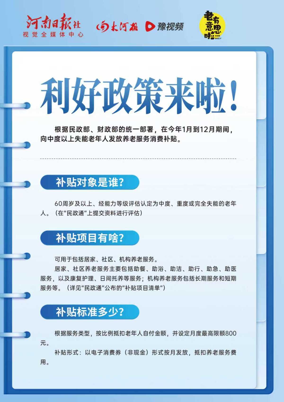这是国家民政部、财政部统一部署、面向全国中度以上失能老年人发放的养老服务消费补贴政策在河南落地的生动缩影。根据政策,2026年1月至12月期间,凡年满60周岁、经专业评估认定为中度、重度或完全失能的老年人,每月可获得最高800元的电子消费券,用于支付助餐、助浴、助洁、助行、助急、助医以及康复护理、日间托养、短期照护等服务费用。