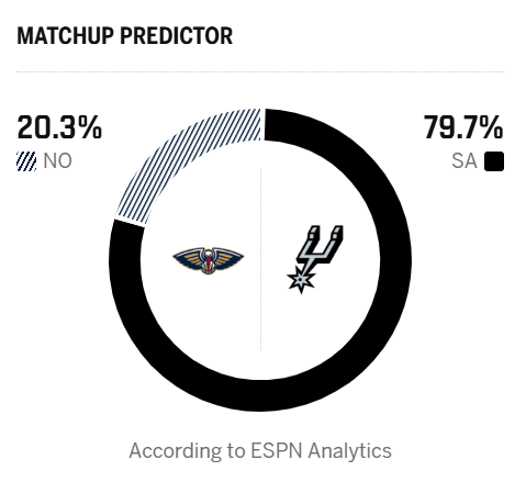 ESPN预测明日比赛:马刺胜率79.7%,鹈鹕胜率20.3%
