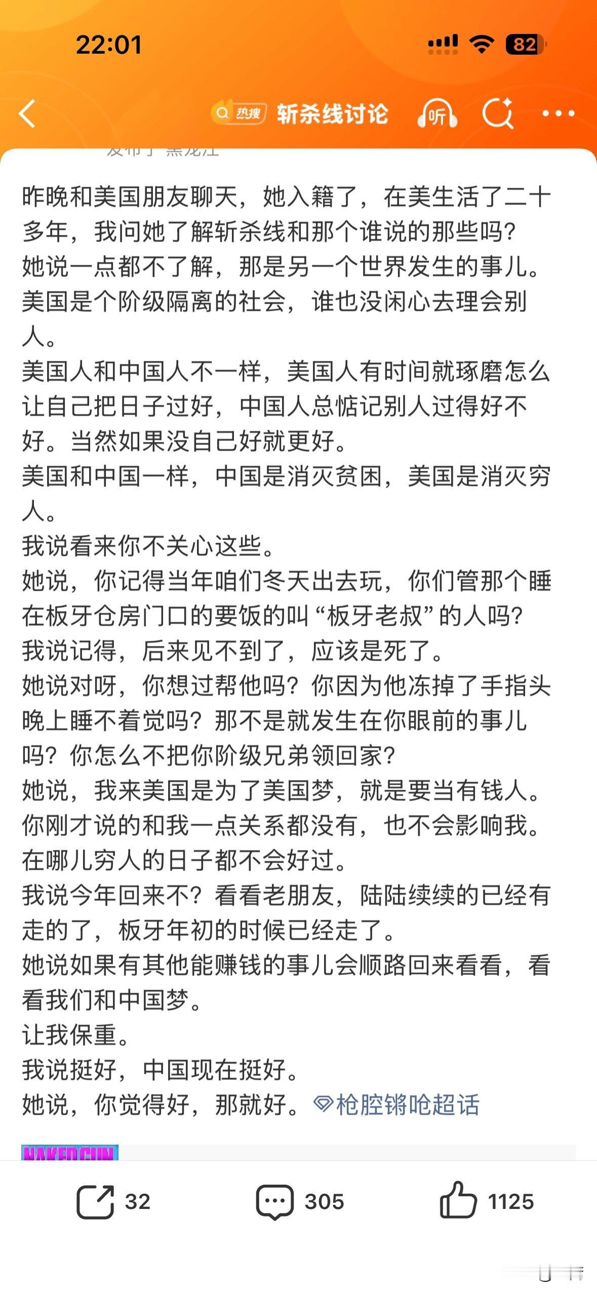 这个已经入籍美国华人回应斩杀线的态度符合大部分在美华人的心理吧! 我那天问刚回国探亲的移民美国的朋友,回国三个月了,她天天看微信看微博,但她一下都不知道牢A是谁,和她提起,她也不在意,而且在她看来,哪里都有天堂和地狱,哪里都存在斩杀线。 我也没去反驳她,没必要,尊重各自的选择,也是一种善良。 正如互联网很多人分析的,在美华人很少沦落到斩杀线的地步,因为大部分华人都具备勤劳节俭的传统和储蓄习惯。移民一代二代或许可以做到,但三代以上的,就不好说了。 适者生存。与其操心那些选择灯塔国的,不如多关心我们自己的国度和社会,多关注我们自己!