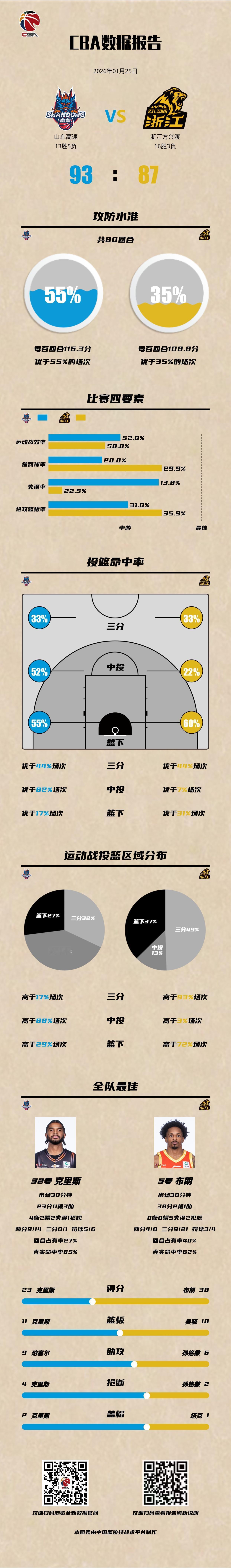 山东高速 93-87 浙江方兴渡山东男篮vs广厦男篮 山东高速:克里斯23分11篮板3助攻4抢断2盖帽,陈林坚18分5篮板3助攻2抢断,陶汉林16分8篮板5助攻; 浙江方兴渡:布朗38分,卡尔顿13分6篮板,孙铭徽10分5篮板6助攻2抢断。CBA数据库