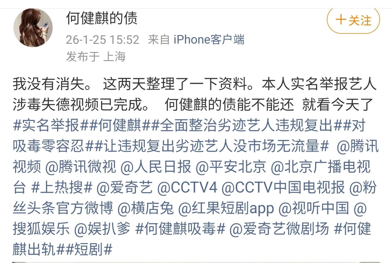 一个叫“何健麒的债”的新号,空口白牙说自己是前女友,实名举报涉毒,结果连个聊天记