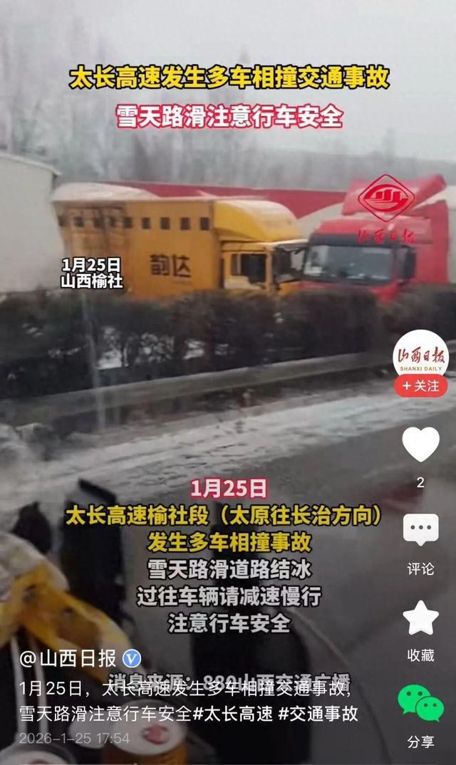据山西交通广播,1月25日早上,山西太长高速太原往长治方向榆北至榆社南之间,发生多车相撞事故。
