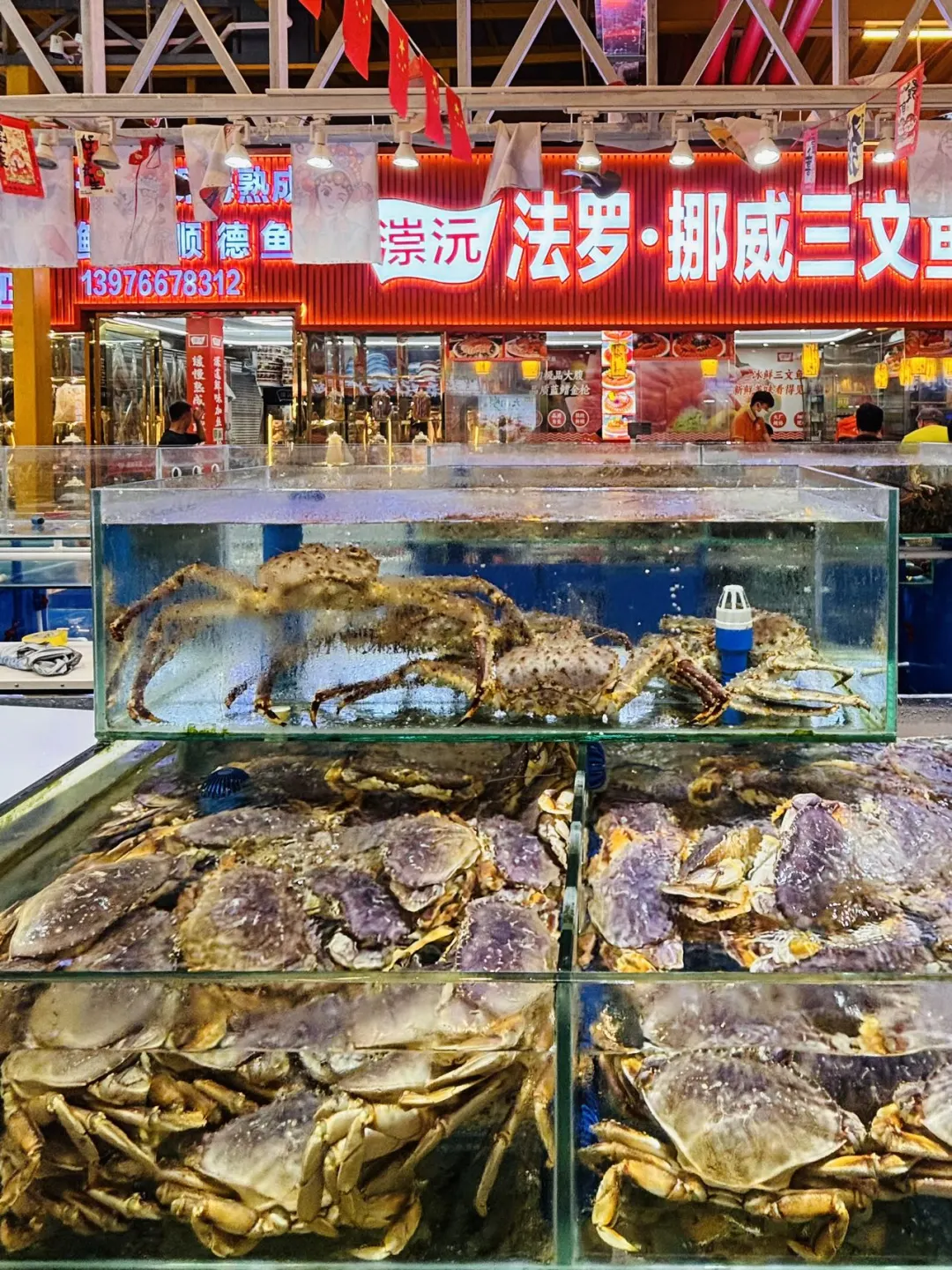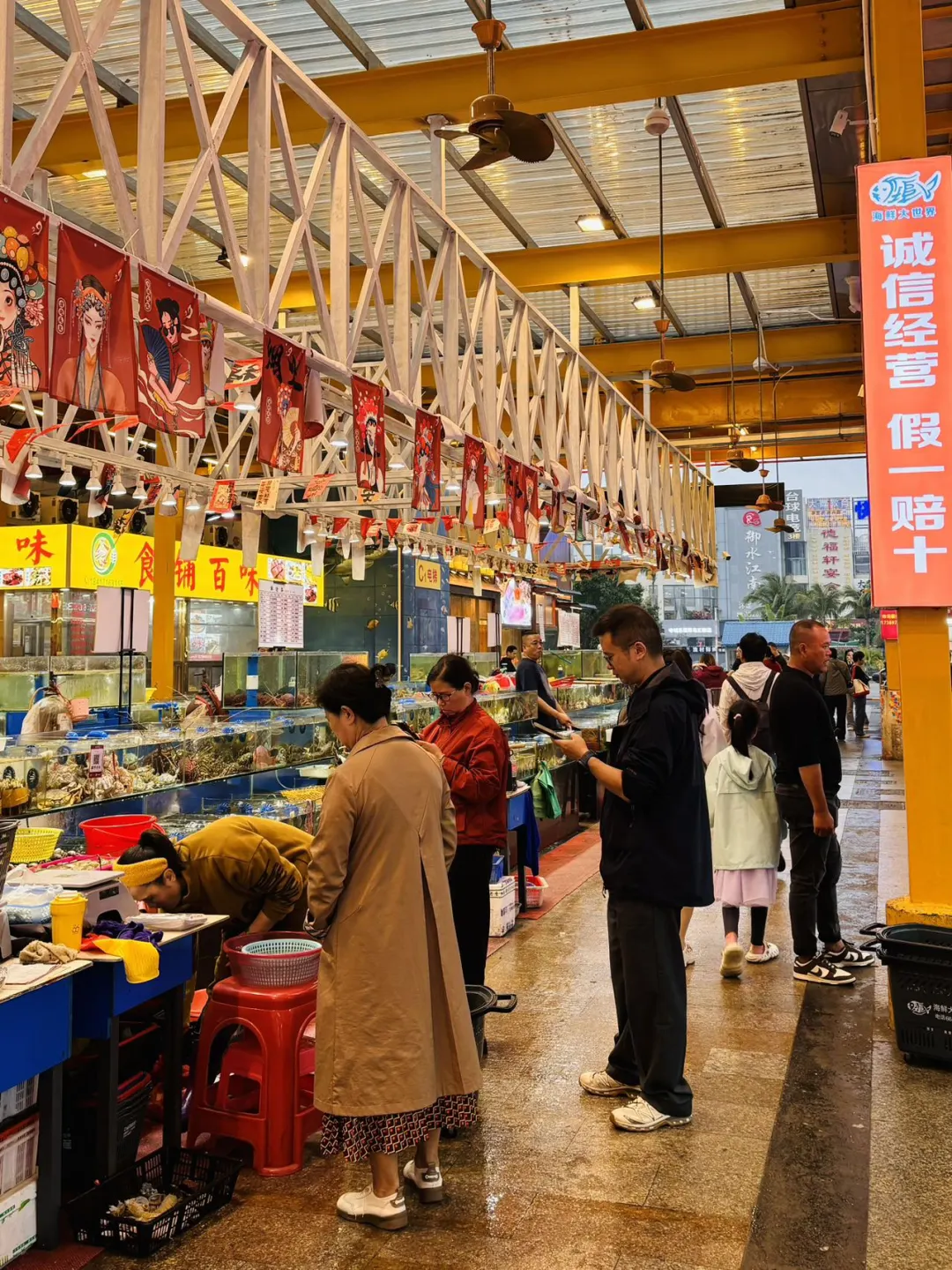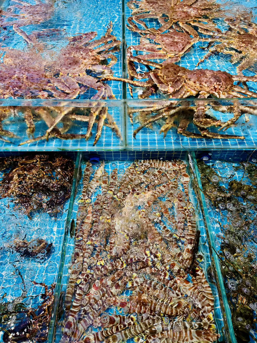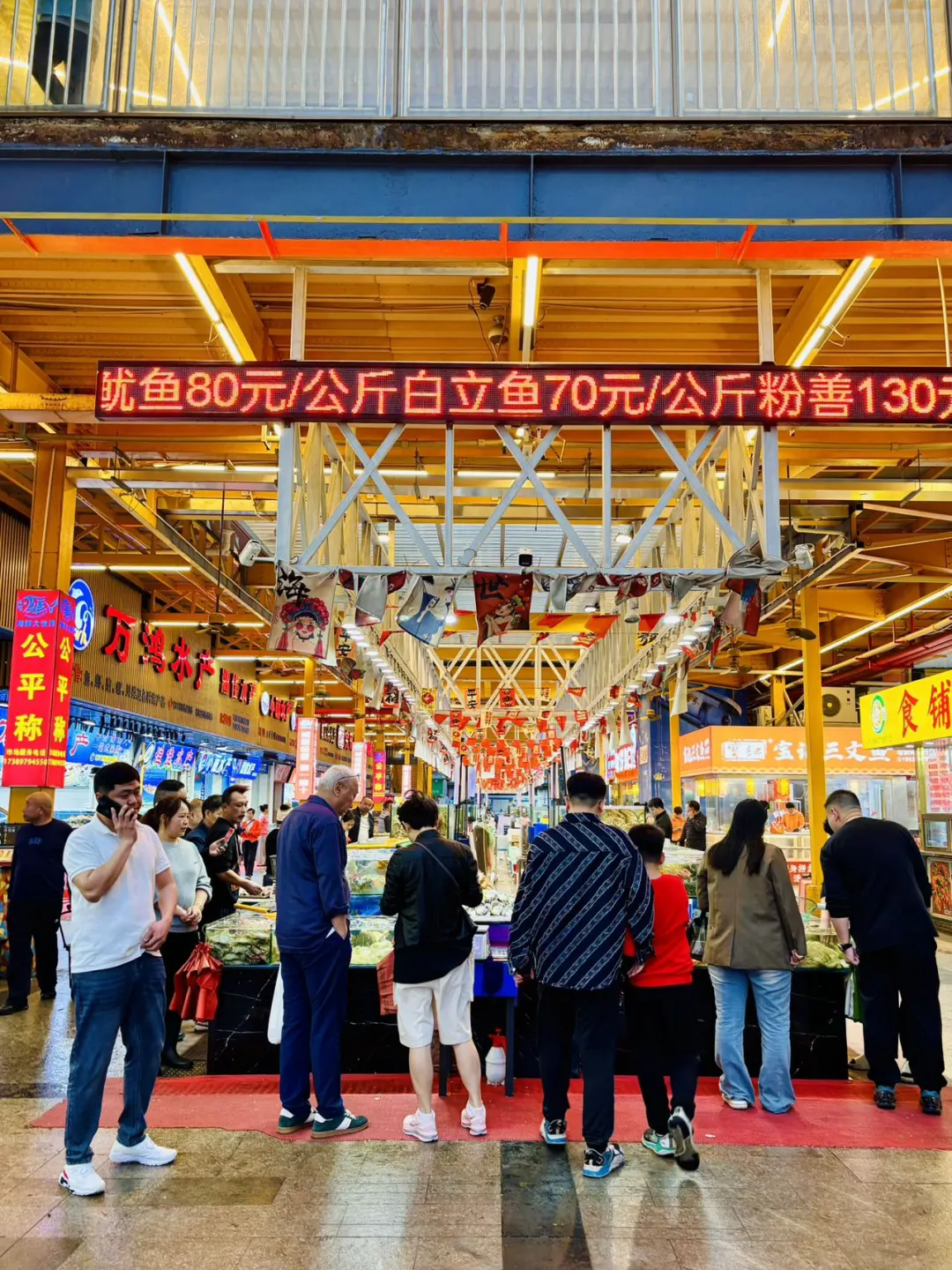 👍这里海鲜品种多到眼花——各种种类的螃蟹、龙虾、海虾、各种海鱼贝类…全在水箱里活蹦乱跳!💰价格都是明码标价,门口还有公平秤,完全不用担心缺斤少两,买得超放心~