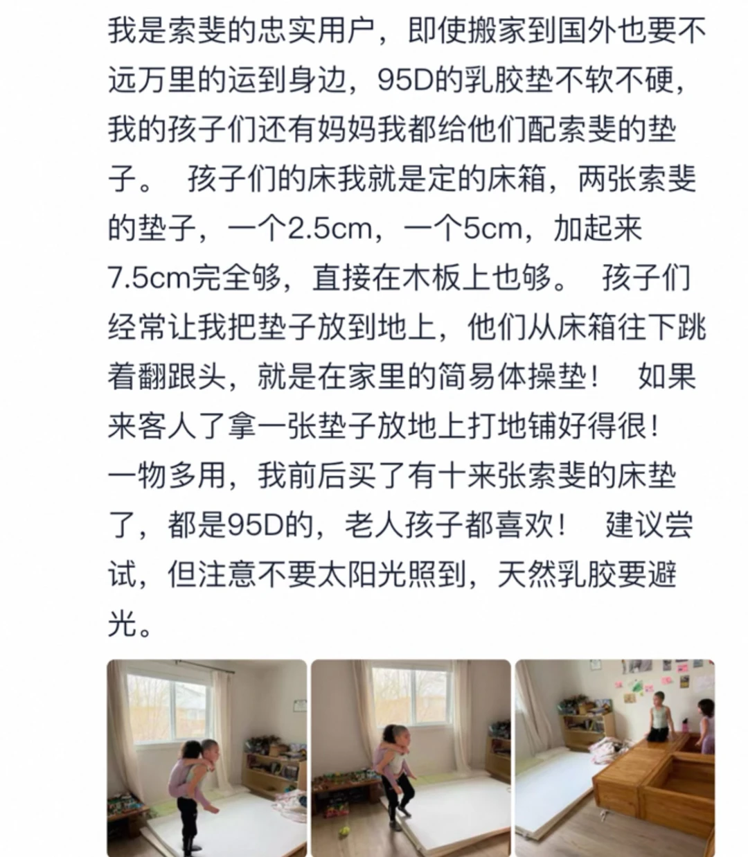 一个忠实老客户的评论,乳胶床垫虽然不一定适合每一个人,但肯定适合大部分人,品质才是乳胶床垫长期受欢迎的关键因素,没有品质的支撑也不会有老客户的支持