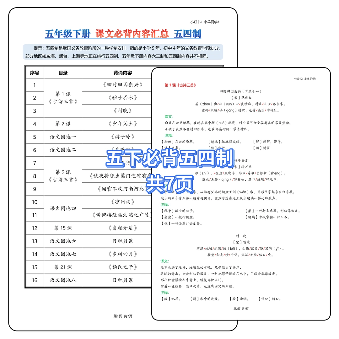 五四制的需求量很少,但是真的承受不了宝子的催更啊~ 五四制五年级下册语文必背的古诗 + 课文全整理好啦✅ 一共7页,内容不多,但是比较零碎~ 一定要提前背诵! 逆袭就靠它了!! 原创整理,禁止转载发布到网络平台哦🙅♀️ 完整版戳店铺就能 get! 提示💡: 五四制是我国义务教育阶段的一种学制安排,指的是小学5年、初中4年的义务教育学段划分。部分地区如威海、烟台、上海等地正在施行五四制。五年级下册内容六三制和五四制内容并不相同。 ⏰当然啦,也有六三制的必背清单哦~评论区获取[红色心形R]