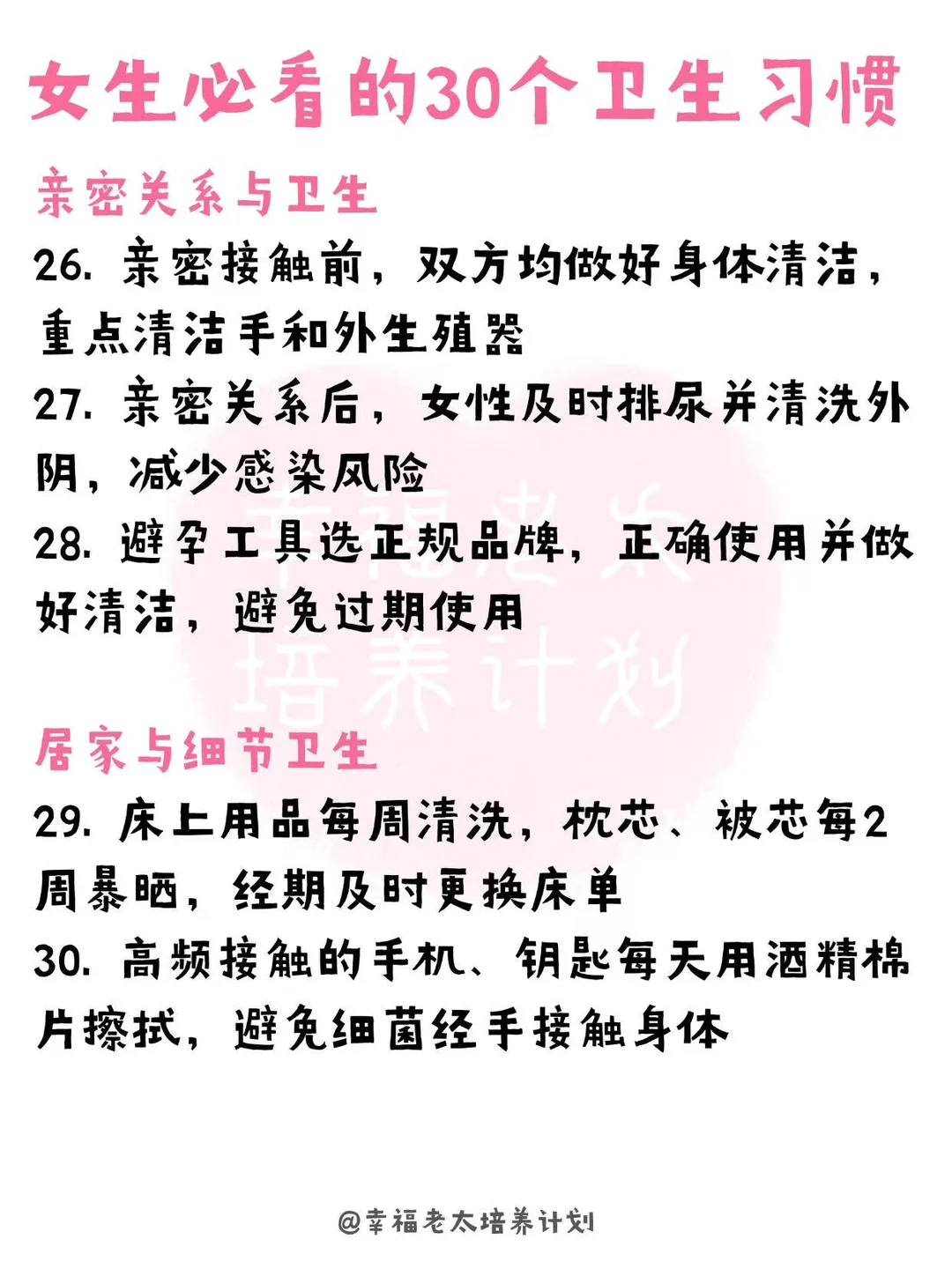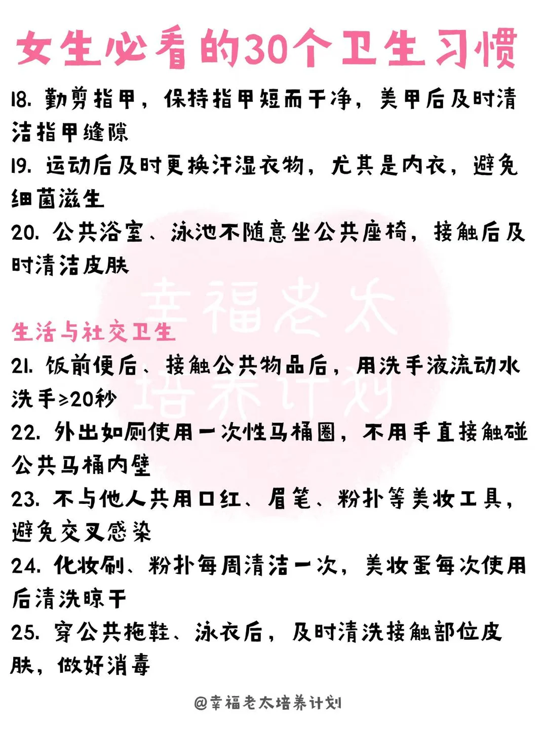 整理了30个超易坚持的日常卫生小习惯,这些习惯不用刻意花时间,把卫生刻在生活里,身体会悄悄给你反馈~干净的体质,才是一切健康的基础,从今天开始,一起做精致又健康的女孩纸吧[飞吻R] (宝子们可以直接截图保存,贴在书桌/冰箱上,时刻提醒自己~)[斜眼R][斜眼R]