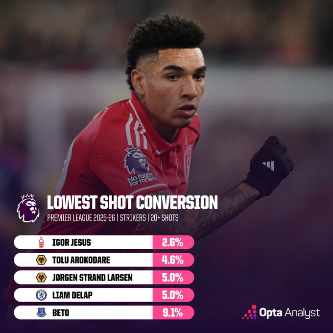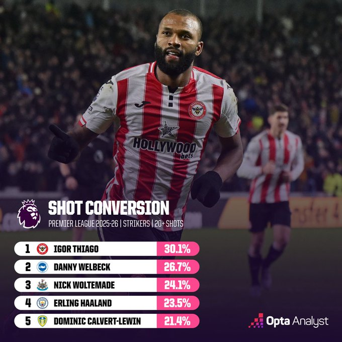 虎扑01月25日讯OPTA盘点了本赛季英超球员射门转化率榜单,具体如下(至少20次射门):