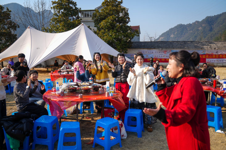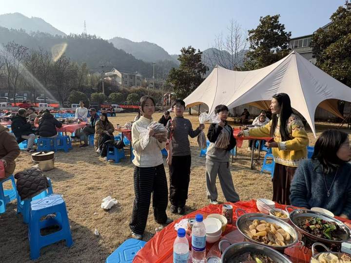 大草坪上,60桌年猪宴圆桌上已经摆放好了暖炉、饮料、碗筷,一些在驿站租赁了自行车骑行浙西天路,或者提前去爬太子尖的游客也纷纷赶了回来,只等开席。