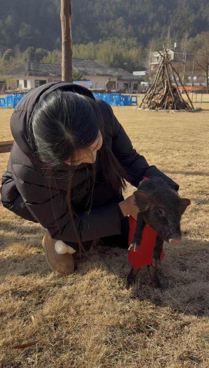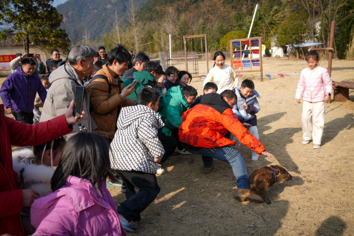 很快,随着点香祈福、净手静心、摁猪放血、烫毛分解等浙西杀年猪古礼有序进行,游客们拍到了丰富素材满意而归,再次将关注点放到了大草坪——一场全民参与、激动人心的抓小猪、赢大奖游戏开始了!