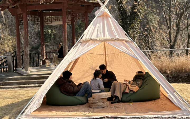 就拿这场山屿溪谷户外驿站的年猪宴来说吧,四周群山、峡谷、水潭、大草坪环绕,音响里播放着动人旋律……在等待年猪宴开席前,无论是溪畔野拍美照,还是小木屋里烤火,或者躺在帐篷里的懒人沙发上小憩,都十分惬意。