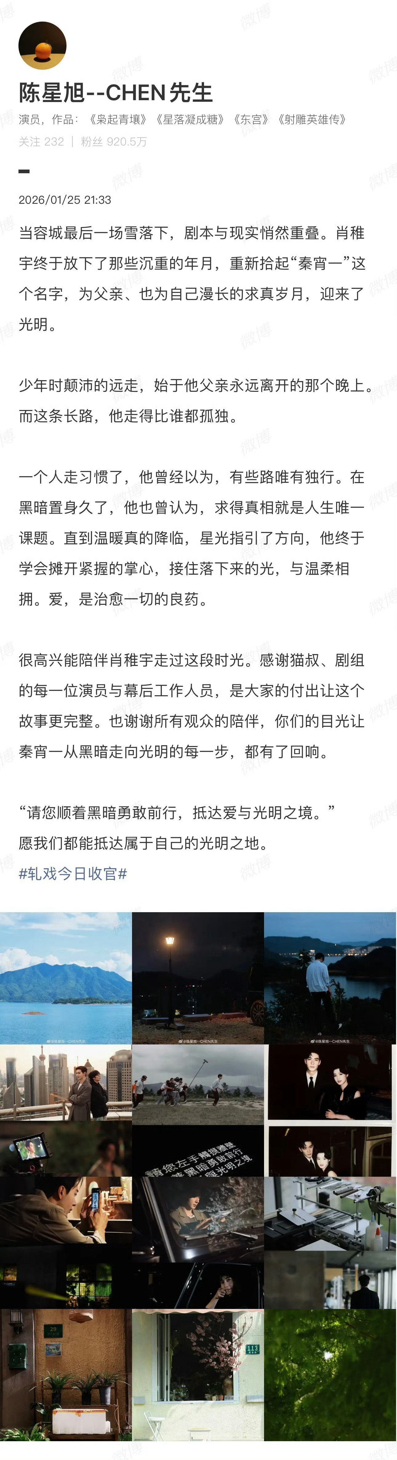 看懂陈星旭收官文的都哭了 陈星旭写下那句“愿我们都能抵达光明”时,肖稚宇或许早已在他心里走完了最后一程。演员提前体验了角色的全部人生,而我们直到落幕才读懂这份用心的重量。戏散了,他却把角色的光留给了观众。