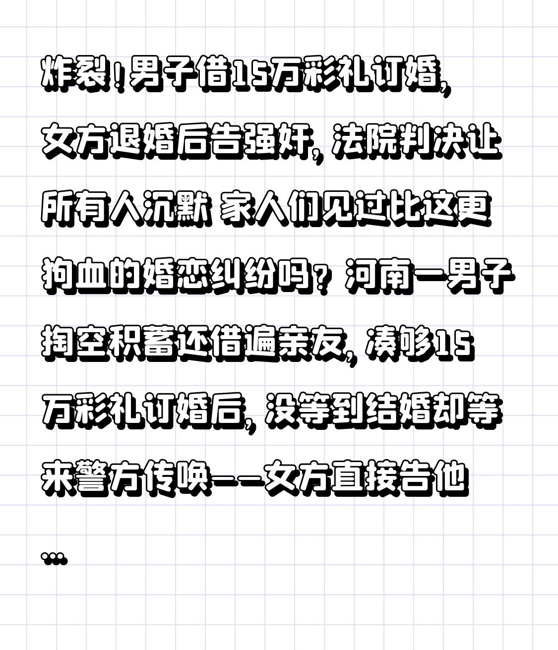 炸裂!男子借15万彩礼订婚,女方退婚后告强奸,法院判决让所有人沉默 家人们见过比这更狗血的婚恋纠纷吗?河南一男子掏空积蓄还借遍亲友,凑够15万彩礼订婚后,没等到结婚却等来警方传唤——女方直接告他强奸!一边是借钱付彩礼的男方,一边是怀孕退婚的女方,这场横跨彩礼、生育、刑事指控的闹剧,最后法院的判决让全网吵翻了天! 事情得从2023年底说起,张某和刘某恋爱才3个月,女方就查出怀孕,双方赶紧敲定婚事,张某按农村习俗付了15万彩礼。可订婚后没几天,刘某发现张某还在和前女友聊天,两人彻底闹掰,女方直接提出退婚。更让人没想到的是,2024年6月,刘某突然以涉嫌强奸为由报警,公安机关立案后却很快撤案,这波操作让张某彻底懵了——明明是自愿恋爱订婚,怎么就成了强奸? 第一个转折点来了:撤案后刘某在医院生下一个女儿,张某怀疑孩子不是自己的,可亲子鉴定结果显示他就是生父。这下张某更窝火了,自己借钱付彩礼,没结成婚还被诬告强奸,于是起诉到法院,要求女方全额返还15万彩礼。而刘某这边也不示弱,辩称自己因张某出轨患上抑郁,还独自抚养孩子,不仅不该退彩礼,还要求张某每月支付1500元抚养费。 就在大家以为这只是普通的彩礼纠纷时,第二个反转浮出水面:法院审理时查明,张某的15万彩礼确实是向亲友借来的,他婚后本就面临巨大还款压力,而刘某退婚报警的行为,确实让他陷入“人财两空”的困境。但同时,刘某生育孩子后独自抚养了5个月,期间张某仅支付过1.25万元生育费,从情理上也有诉求依据。 最关键的法律认定来了:法院明确,订婚不等于女方默认性同意,即便有彩礼往来,违背妇女意志发生性关系仍可能构成强奸,但本案中公安机关已撤销强奸指控,说明现有证据不足以认定犯罪事实。而彩礼返还方面,考虑到女方已生育孩子、双方均有过错,最终判决刘某返还50%彩礼,也就是7.5万元,同时张某需每月支付抚养费。 这起案件其实戳中了很多人的痛点:高额彩礼让婚姻变了味,恋爱中的边界感更是容易被忽视。就像山西“订婚强奸案”的判决所明确的,哪怕订了婚,没领证就没有夫妻权利,性自主权永远受法律保护;而彩礼也不是“买婚钱”,一旦婚姻无法缔结,结合实际情况合理返还才符合公平原则。 现在越来越多的婚恋纠纷,都因彩礼、出轨、边界不清而起。婚姻本该是两情相悦的归宿,不是金钱交易,更不是互相伤害的战场。你觉得这7.5万的彩礼返还合理吗?如果是你遇到这种情况会怎么做?评论区聊聊你的看法,点赞转发,让更多人明白:婚恋有温度,法律有底线,别让彩礼毁了爱情,也别让冲动触犯法律!