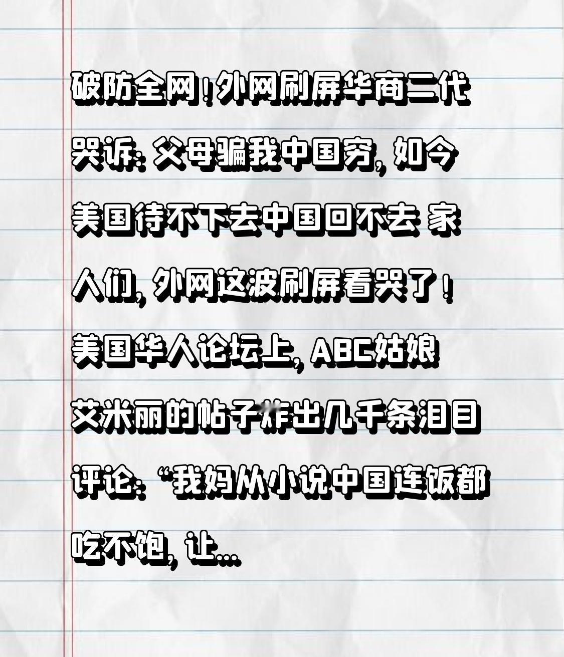 破防全网!外网刷屏华商二代哭诉:父母骗我中国穷,如今美国待不下去中国回不去 家人们,外网这波刷屏看哭了!美国华人论坛上,ABC姑娘艾米丽的帖子炸出几千条泪目评论:“我妈从小说中国连饭都吃不饱,让我扎根美国,结果去年回上海,路边摊都能手机付款,高铁4.5小时直达北京,而我从纽约去波士顿,火车摇6小时还得付现金!” 更扎心的是她的灵魂拷问:“在美国被当‘中国佬’,回中国被笑‘只会说洋话’,我到底是谁?” 这不是个例,而是无数华商二代的集体迷茫。上世纪80、90年代,不少华人父母轻信西方“天堂宣传”,卖掉广州、上海的房子,东拼西凑凑够机票,带着孩子背井离乡。他们一边在唐人街洗盘子、开餐馆,每天累到凌晨,一边给孩子灌输“美国啥都好,中国太落后”,甚至刻意不让孩子学中文,怕被歧视。洛杉矶华人阿姨1998年卖掉静安区的房子移民,当年20多万的房产,如今市值千万以上,她儿子刷到中国高铁视频,哭着质问妈妈:“你为什么要骗我来这里受苦?” 第一个转折点,是互联网戳破了所有谎言。华商二代们刷着中国的5G、移动支付、繁华CBD,再对比自己在美国挤漏风地铁、用支票被嫌弃的处境,认知彻底崩塌。纽约华人司机的儿子,从小被教导“中国落后”,长大后只能做餐厅服务员,而父亲当年的同事,留在国内早已住上大平层,退休金比他家餐馆利润还高。更让他们崩溃的是,美国的“种族天花板”从未消失:华尔街华裔精英业绩远超同事,晋升时却被以“不符合公司形象”刷掉;校园里被骂“中国佬”,深夜不敢独自出门,父母口中的“天堂”,满是看不见的歧视与危险。 第二个反转,是“回不去的中国”带来的尴尬。很多华商二代从小只学英语,18岁第一次回国,对着菜单上的宫保鸡丁一脸茫然,只能用英语点餐;参加同学聚会听不懂网络热词,只能躲在角落玩手机。他们想回中国寻根,却发现自己像个“外人”:不会说中文,不懂传统文化,连基本社交都成问题。有男孩回国创业,因不熟悉国内规则屡屡碰壁,最后只能灰溜溜回到美国,陷入“融不进的美国,回不去的中国”的两难。 更戳心的是两代人的双重遗憾。父母们看着中国崛起,满心后悔:“早知道中国会这样,绝不会离开”;而华商二代们,既要承受美国的歧视与困境,又要面对中国文化的隔阂,还要背负父母的愧疚。就像一位网友留言:“父母用一辈子的辛苦,换来了我们两代人的迷茫,这到底是谁的错?” 其实这不是谁的错,而是时代的错位与信息的鸿沟。当年父母的选择,源于对更好生活的向往,却没料到中国会发展得如此迅猛;西方的宣传陷阱,收割了华人的劳动力与资金,却从未真正接纳他们。而如今,越来越多华商二代开始觉醒:有人回国重新学中文,有人带着美国的技术经验回国创业,有人直言“这里的风是往前吹的,机会比美国多太多”。 从“西渡寻梦”到“东归筑巢”,华商二代的迷茫与觉醒,见证了中国的崛起与世界格局的变迁。根在哪里,家就在哪里,文化的血脉从不会被距离切断。或许他们曾迷失,但只要转身望向东方,就会发现,祖国永远是最温暖的港湾。 你怎么看待华商二代的“破防”?如果是你,会选择留在国外还是回国发展?评论区聊聊你的看法,点赞转发,让更多人看到这份跨越山海的迷茫与归途!