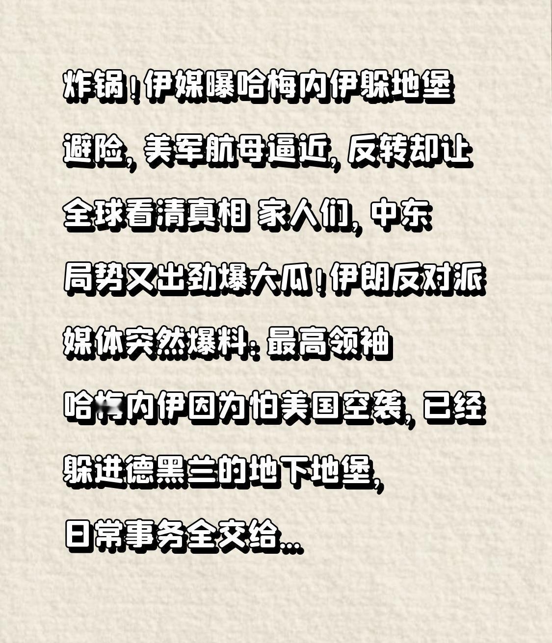 炸锅!伊媒曝哈梅内伊躲地堡避险,美军航母逼近,反转却让全球看清真相 家人们,中东局势又出劲爆大瓜!伊朗反对派媒体突然爆料:最高领袖哈梅内伊因为怕美国空袭,已经躲进德黑兰的地下地堡,日常事务全交给三儿子代管!消息一出,国际油价直线波动,网友们炸了锅:“难道美伊要开打了?” 可就在所有人以为大战在即的时候,一连串反转却让这场“避险大戏”变成了笑话! 先看这则爆料多会挑时候:1月25号消息放出时,美国“林肯”号航母刚抵达印度洋,美军还疏散了中东基地的非必要人员,一副剑拔弩张的架势。爆料的“伊朗国际电视台”更是添油加醋,说这地堡有连通隧道,防御能扛住精准打击,把紧张氛围拉满。不明真相的网友纷纷猜测:“肯定是伊朗怕了,高层都先跑路了!” 第一个转折点来了:伊朗官方当天就火速辟谣!驻印度领事馆直接打脸,说哈梅内伊一直在通过视频会议正常主持国家事务,所谓“躲地堡”纯属无稽之谈。更打脸的是,大家扒出爆料媒体的老底——这台总部在伦敦的电视台,长期受美国和沙特资助,跟流亡的伊朗前王室关系密切,历史上多次编造“哈梅内伊交权”“高层分裂”的谣言,根本没有可信度。 更关键的反转在军事动态上:伊朗革命卫队不仅没慌,反而高调宣布进入最高戒备状态,副总司令瓦希迪放话“已准备好让敌人后悔的回应”。卫星图显示,伊朗连夜把导弹、无人机转移到隐蔽阵地,还加强了空域管制,完全是严阵以待的防御姿态,哪里有半点“高层恐慌”的样子?而所谓“地堡避险”的描述,被军事专家戳穿:这根本是照搬美军的战术评估报告,纯属凭空想象。 第三个反转更有意思:哈梅内伊1月17号还公开露面,在德黑兰发表讲话,直接点名特朗普,痛骂美国煽动伊朗国内骚乱,说这是“美国策划的犯罪行为”。视频里他语气强硬,思路清晰,要是真怕空袭,怎么可能提前一周公开亮相?而且伊朗官方媒体随后放出他主持线上会议的画面,彻底击碎了“失联躲地堡”的谎言。 其实这事儿压根不是什么“避险”,而是一场精心策划的舆论战!美国一边派航母军事施压,一边让反对派媒体散布虚假消息,目的就是瓦解伊朗内部士气,制造国际误判。可伊朗根本不上当,一边强硬回应军事威胁,一边戳破舆论骗局,让全球看清了美国“舆论先行、军事跟进”的老套路。 现在大家终于明白:所谓“哈梅内伊躲地堡”,不过是美伊博弈中的一出闹剧。国际政治就像一场大戏,劲爆消息背后往往藏着算计,我们看热闹的同时,更得学会分辨真假。美国想靠舆论战搞垮伊朗,可伊朗的强硬反击和冷静应对,早就说明了谁才是真正的底气十足。 最后想问大家:你觉得美伊真的会开战吗?面对这种国际热点,你会怎么分辨消息真假?评论区聊聊你的看法,点赞转发,让更多人看清这场舆论战的真相!