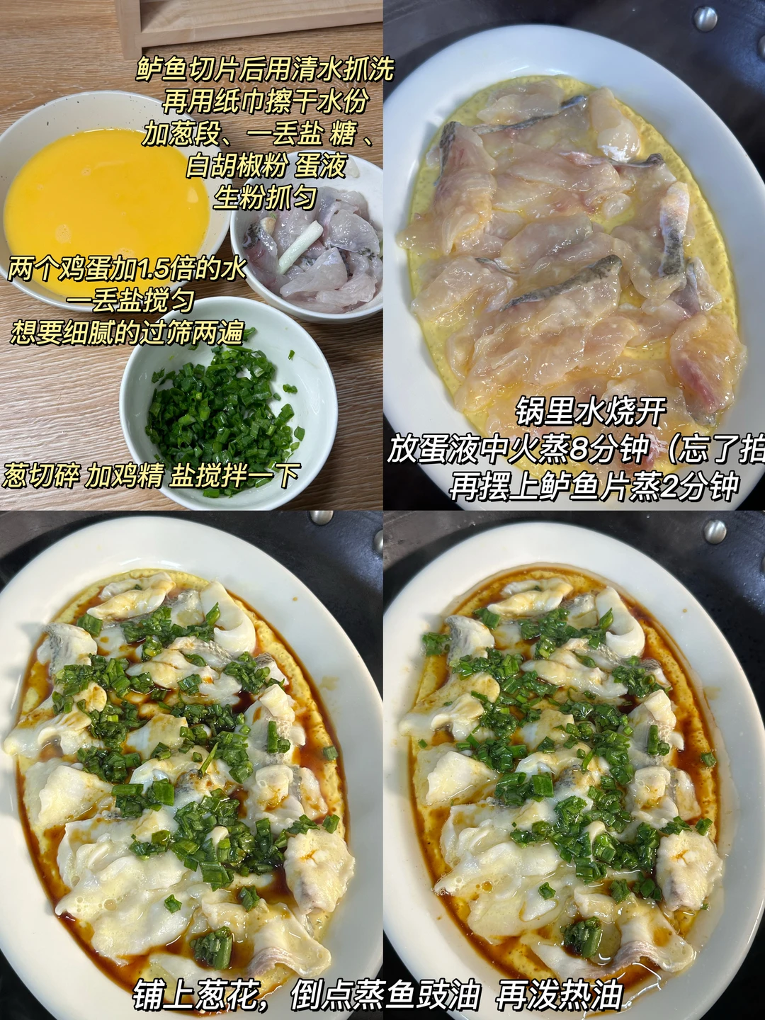 小朋友隔几天就会主要点名的菜,我们鲈鱼和鳜鱼换着来 都很嫩滑[赞R]鱼骨鱼头煎一煎加内酯豆腐煮汤,一点都不浪费~ ✨食材:鲈鱼 鸡蛋 葱 1️⃣:锅里水烧开,放入鸡蛋羹,中火蒸8分钟(可以盖上保鲜膜或者一个盘子 水蒸气不会滴下来) 再摆上腌好的鲈鱼片,再蒸2分钟,铺上葱花,淋蒸鱼豉油,泼热油增香。 好好吃饭呀🖖🏻