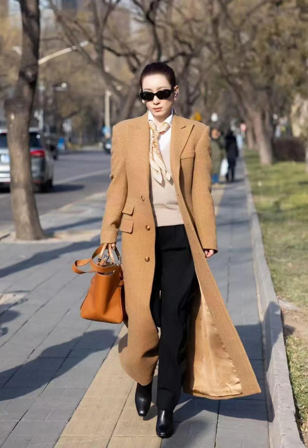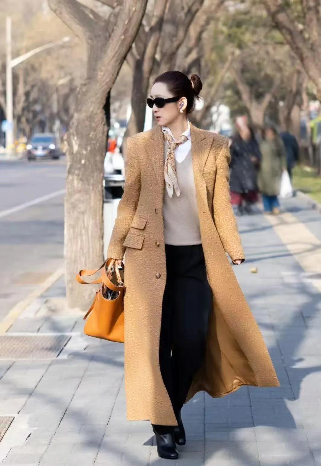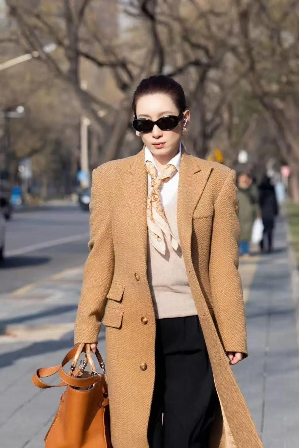 秦海璐这波穿搭我直接锁死🔒 驼色大衣一披,丝巾一系,走路都带风! 简约又大