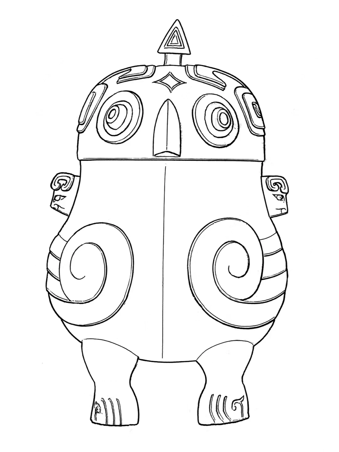 这件鸮卣整体呈椭圆体,形如两鸮相背而立。盖为双鸮首,环目,尖喙,弯眉,盖中央置四阿顶方柱钮,饰雷纹。腹作双鸮身,子口微敛,垂鼓腹饰卷曲羽翼纹。身下为四足,两两相背,蹄形足,饰爪纹。盖腹相合,两鸮昂首背立。不仅可以实用,也是相当精美的艺术品。以猫头鹰为原型制作青铜器是商代常见的样式,对猫头鹰的偏爱源自于古人对于鸟的崇拜。外表像鸮的青铜器不只这一件,如湖北应城、河南安阳殷墟妇好墓、湖南长沙东山镇等地也出土了形制相仿的商代鸮卣。