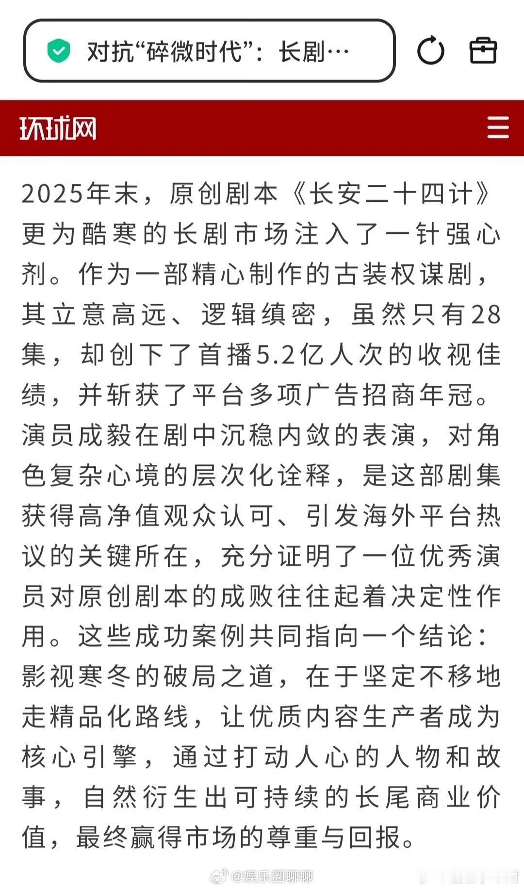 成毅有大智慧,很会选剧本环球网深度分析影视寒冬原因。莲花楼赴山海作为优秀长剧,优秀ip开发代表,长安二十四计作为优秀原创剧本代表,被点名表扬。还特别提到了成毅的商业价值。成毅优秀👏👏👏