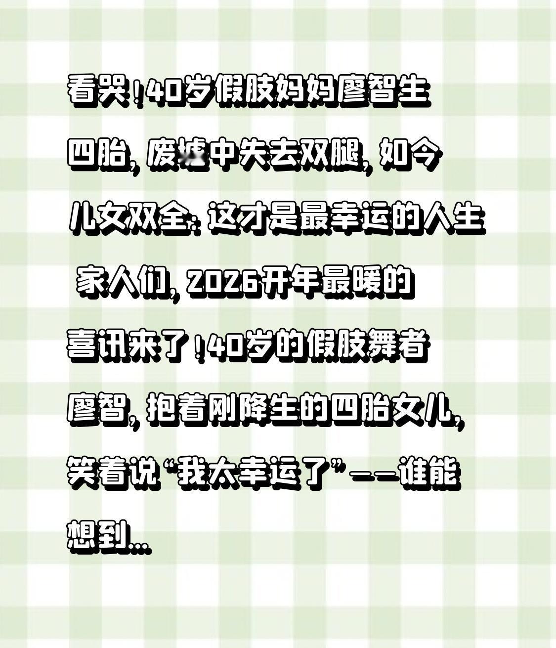 看哭!40岁假肢妈妈廖智生四胎,废墟中失去双腿,如今儿女双全:这才是最幸运的人生 家人们,2026开年最暖的喜讯来了!40岁的假肢舞者廖智,抱着刚降生的四胎女儿,笑着说“我太幸运了”——谁能想到,这个被三个哥哥姐姐围着喊“妈妈”的幸福女人,曾在汶川地震的废墟中被困26小时,失去双腿、痛失女儿,还遭遇婚姻破裂,如今却用假肢撑起了五口之家,把苦难活成了光! 2008年的汶川地震,是廖智一生的分水岭。23岁的她本是热爱舞蹈的老师,有可爱的女儿和美满的家庭,却在一瞬间失去一切:10个月大的女儿、疼爱她的婆婆永远离开,双腿因长时间压迫感染被迫截肢。手术后醒来,她看着空荡荡的裤管,连活下去的勇气都快没了,可当摸到腿上的疤痕,她突然想起女儿的笑脸,暗下决心“要替她好好活”。 第一个转折点,是舞蹈给了她重生的力量。装上假肢的第一天,她站着都疼得浑身发抖,却硬要扶着墙练习走路,磨破皮肤、渗出血迹是常事,丈夫心疼劝她放弃,她却咬着牙说“我还能跳舞”。终于,她戴着假肢站上舞台,创作的舞蹈《鼓舞》震撼全场,空荡荡的裤管随着鼓点飞扬,那是对命运最倔强的反抗,也是对生命最热烈的致敬。 更让人动容的是第二个反转:她把自己的苦难,变成了照亮他人的光。在重庆创办“晨星之家”康复工作室,名字寓意“日出前的星光”,专门帮助截肢者重拾生活信心。云南女孩千千因意外截肢后抗拒假肢,廖智每天陪着她训练,笑着说“假肢不是负担,是让你重新奔跑的翅膀”;雅安地震时,她刚录完节目就穿上假肢加入救援队,顶着余震搬运物资,被网友称为“最美志愿者”。她还把获得的奖金悄悄汇给残疾孩子,自己却穿着磨破的假肢奔波在公益一线。 命运从不辜负勇敢的人,第三个转折是爱情与家庭的馈赠。她与现任丈夫查尔斯因假肢定制相识,这个懂她、疼她的男人,亲手为她设计了7副假肢,适配带娃、公益、演出等不同场景。婚后,她陆续生下三个孩子,40岁时意外怀上四胎,面对“高龄+假肢生娃太冒险”的质疑,她用行动回应:孕期30周每天爬30层楼梯锻炼,生宝宝前一天还在准备公益夏令营物料,全程戴着假肢产检,丈夫始终寸步不离陪伴。 生产那天,宫缩的剧痛让她浑身冒汗,假肢磨得伤口隐隐作痛,可当听到四胎女儿6斤8两的啼哭,她瞬间红了眼眶:“这一次把前三胎的痛都补回来了,但家人的支持、医疗的助力,让我觉得无比幸运”。如今,大女儿主动认领喂奶粉的任务,二儿子化身“护妹狂魔”,老三拿着绘本给妹妹“讲故事”,一家五口的画面温馨得让人落泪。 有人问她“带着假肢生四胎,不怕危险吗?”,廖智笑着回应:“幸运不是老天赐予的,是自己挣来的。我失去过太多,所以更珍惜眼前的幸福”。这些年,她戴着假肢跳舞、做公益、带孩子,从废墟中爬起,用热爱对抗苦难,用善良温暖世界,她的“幸运”,从来都是咬牙坚持的结果,是爱与被爱的馈赠。 廖智的故事告诉我们:人生没有绝境,哪怕命运给你关上所有门,也会为你留一扇窗。失去双腿又怎样?戴着假肢照样能跳舞、能生娃、能做公益;遭遇苦难又怎样?只要心怀热爱,就能把日子过成诗。所谓幸运,不过是历经风雨后,依然选择向阳而生。 愿廖智和她的孩子们永远幸福,也愿每个经历过坎坷的人都能明白:热爱可抵岁月漫长,善良能暖世间寒凉。你被廖智的故事打动了吗?评论区聊聊你的感受,点赞转发,让这份正能量传递下去,也为这个了不起的妈妈点个赞!