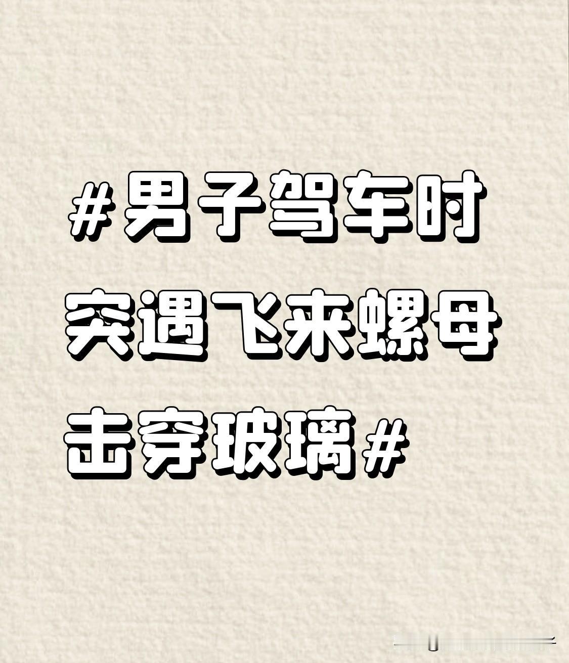 男子驾车时突遇飞来螺母击穿玻璃 开车时遭遇飞来横祸太可怕了。之前有男子在沪昆高速上开车,突然飞来一颗螺母击穿挡风玻璃,他还以为是“子弹”,所幸他开的是SUV,底盘高,螺母砸在挡风玻璃中下部,只伤了手,人无大碍。这螺母估计是掉在路上被大货车碾轧弹起的。 还有李先生驾车在高架上,被和脑袋一样大的飞石“突袭”,石头穿透玻璃砸到他脸上,导致面部粉碎性骨折、牙齿损伤。虽说交警扣留了疑似肇事的大货车,但结果还得等鉴定。高速行驶中,这些飞来的物品就像“暗器”,真让人防不胜防,大家开车可得多留意啊。