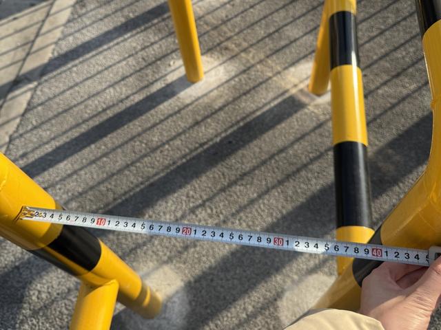 附近的市民告诉记者,黄黑的路桩大约是近2个月安装。不少上班的非机动车会停在地铁口附近,可能影响了行人出入。为了划定专门的停放区域,管理人员用路桩将此路段封堵,其他车辆都安排停放在空港一路一侧。在走访时,记者看到,由于路桩是交错平行设置,有携带较多行李包裹的乘客在通行时费劲,需要单独将小型背包、包裹拿单独拿下来,才能顺利让行李箱通过。记者用卷尺测量了路桩交错后的通行宽度,平均在40厘米至43厘米之间。常规行李箱厚度在27厘米-30厘米,基本能推行通过。但对于常规轮椅和儿童车来说显然并不能。