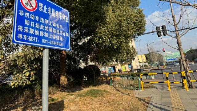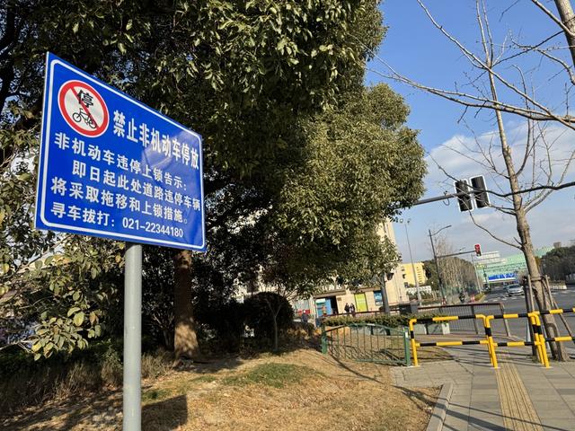 当旅客从无障碍电梯口出来,就会来到此处长廊。同时,也能看到一条直通的下坡道,前往迎宾一路上街沿人行步道。记者蹲守期间了解到,有部分在附近酒店入住或选择打车前往其他目的地的旅客,会顺着指引来到此处人行步道。迎宾一路两侧人行步道的尽头,记者看到了黄黑相间的U型隔离路桩,其中一头与绿化带的绿色栅栏连接,做到了严防死守。一块路牌显示,此处路段禁止非机动车停放。对于违停的车辆将采取拖移和上锁措施,附上了寻车电话。