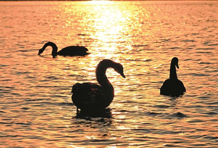 近日,在秀洲区秀湖畔,夕阳西照下的湖面愈发宁静,一只只天鹅和野鸭在湖面游弋,整个湖面像被披上了一层金色,美不胜收。