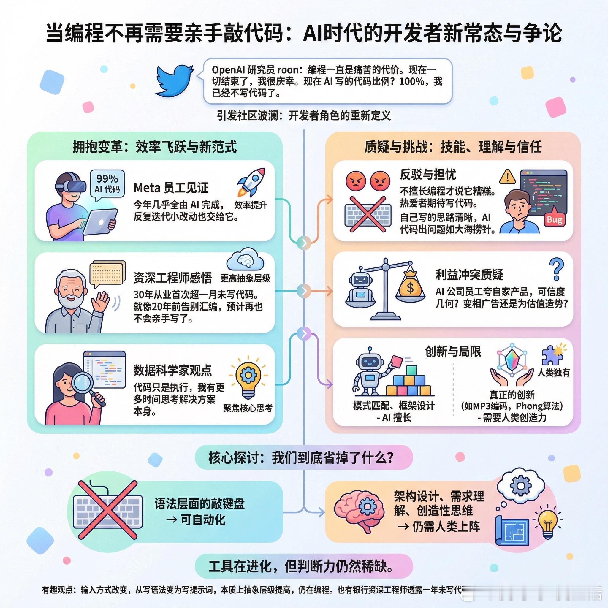 【当编程不再需要亲手敲代码】OpenAI研究员roon最近在推特上引发了一场关于编程未来的讨论。他直言:编程一直是件痛苦的事,是所有想让计算机做有用工作的人必须承受的代价。现在这一切结束了,他很庆幸,甚至有点怨恨计算机为什么不能一直这样工作。当被问到现在有多少代码是AI写的时,他的回答简单直接:100%,我已经不写代码了。这番话在开发者社区掀起波澜。支持的声音不少。有Meta员工表示,今年99%的代码行都是AI帮忙完成的,虽然需要反复迭代,但即便是小改动也会交给AI处理。一位从业30年的资深工程师说,这是他职业生涯中第一次超过一个月没写过一行代码,他预计自己再也不会亲手写代码了,就像20年前告别汇编语言一样。但质疑的声音更为激烈。“一个说编程一直很糟糕的人,恐怕本来就不擅长编程。”这是社区里最常见的反驳。有人指出,真正热爱这份工作的开发者,每天最期待的就是能坐下来写几行代码。还有人表示,当你自己写代码时,思路会深深印在脑海里;而AI生成的代码一旦出问题,你得在几百行陌生代码里大海捞针。更尖锐的批评直指利益冲突:一个在AI公司工作的人,说自家AI产品多么神奇,这能有多少可信度?有人调侃这不过是变相广告,也有人猜测是为了给公司估值造势。技术层面的讨论同样精彩。有经验丰富的架构师分析说,编程中大量工作本质上是模式匹配,面向对象设计、常见框架,这些恰恰是大语言模型最擅长的。但真正的创新,比如当年发明MP3编码、设计Phong着色算法,需要的是人类独有的创造力,AI目前做不到。一个有趣的观点是:说不写代码其实有歧义。很多人只是不再敲键盘输入语法,但他们仍然在写需求、调试、审查、迭代。这更像是输入方式变了,从写语法变成写提示词,本质上还是在编程,只是抽象层级提高了。有银行的资深工程师透露,他也一年多没写过代码了。这让一些人惊呼:银行系统竟然用AI生成代码,请告诉我是哪家银行,我好绕着走。也许最务实的总结来自一位数据科学领域的从业者:代码只是想法的执行,现在我有更多时间思考解决方案本身了。这场讨论的核心问题其实是:当我们说不写代码时,到底省掉了什么?如果是语法层面的敲键盘,那确实可以自动化。但如果是架构设计、需求理解、创造性思维,这些恐怕还要人类亲自上阵。工具在进化,但判断力仍然稀缺。www.reddit.com/r/OpenAI/comments/1qmjr6f/openai_engineer_confirms_ai_is_writing_100_now/