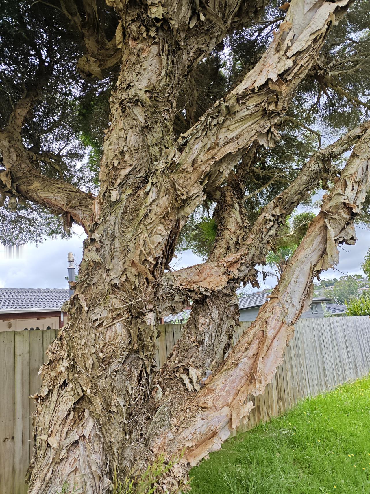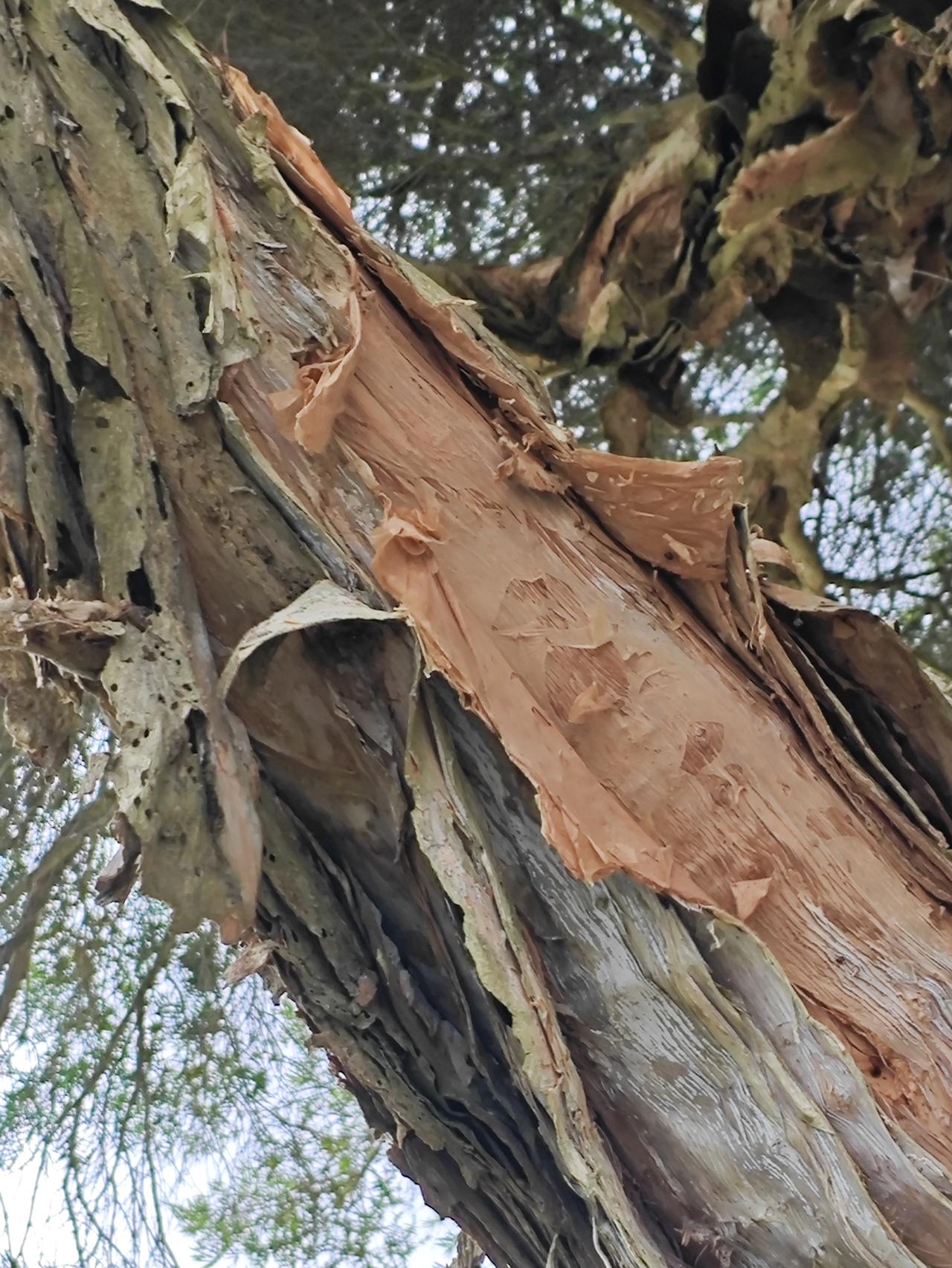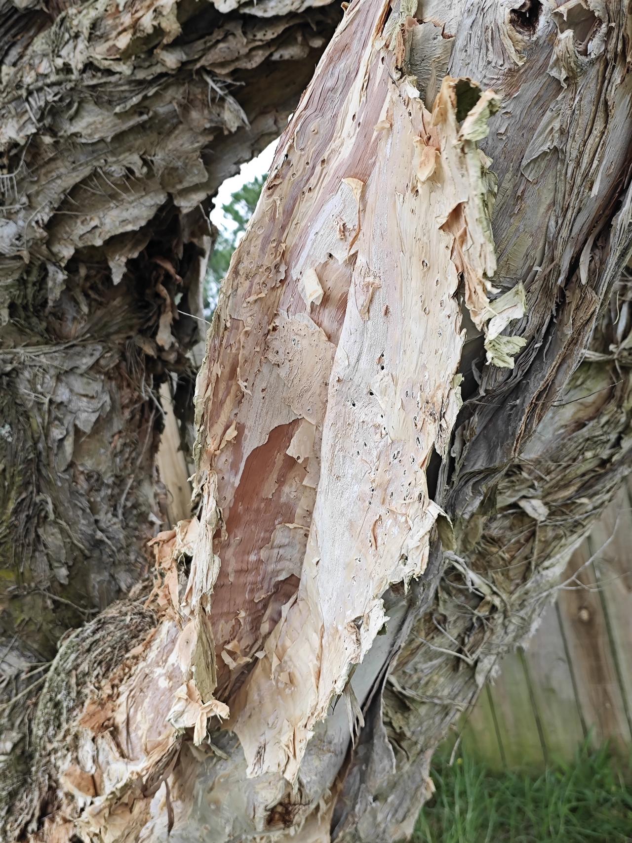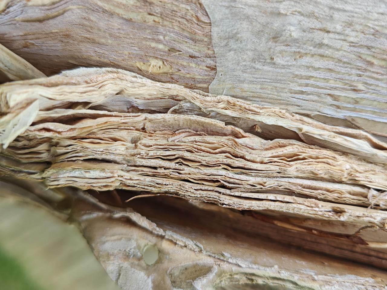 纸皮树,你见过吗? 出门左拐,一百米多就可见我要说的这棵纸皮树。树冠大如巨伞,直径10米有余,树干多支而粗壮,树皮为开裂状的一层层纸状物,呈黄褐色,细观其状,开裂的树皮,有的就像一片道林纸,有的薄如蝉翼,总体来说厚薄不均,自然开裂,也像一个乞丐身上的破衣服片…… 经常从这里走过,看着有些脏而不曾细细观察。今天路过,远看很有树形,巍峨屹立,近看都像破衣服片。我就疑惑,这一层层薄如纸片的树皮,是怎么长成的?不急,咱有豆包,问一下便知。 纸皮树是通俗叫法,它的正式名字是白千层树,也叫脱皮树,是姚金娘科白千层属的植物。原产于澳大利亚,新西兰北岛奥克兰地区等,经常用于庭院观景和防风树种,其树叶可以提取茶树精油,具有消炎杀菌作用。 它的树皮分层生长,由多层的软木细胞组成,细胞不断分裂,向外堆积而成,随着新细胞的生成,外层的老细胞逐渐失去水分而脱落,这种边生长边脱落的模式,让它的树皮始终保持柔软多层的状态,这也是“纸皮树”名字的由来。 看着这棵纸皮树,想起了我们的古人曾经在树皮上写字的历史。如果说纸皮树那个时候生长在我国,这样的树皮写字该有多好啊!