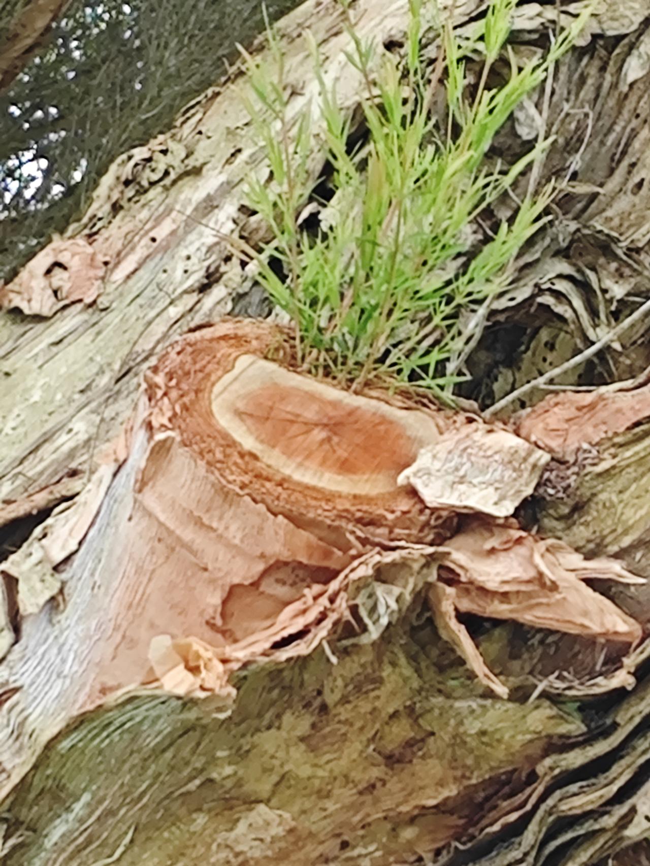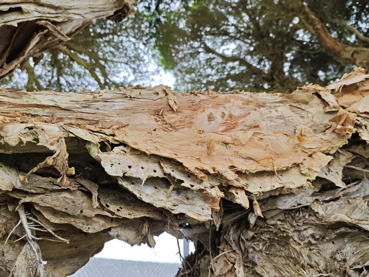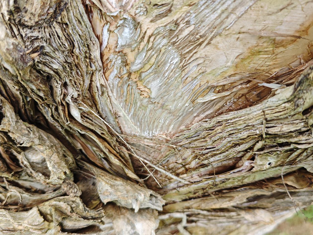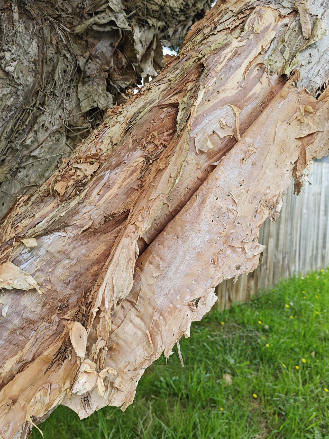 纸皮树,你见过吗? 出门左拐,一百米多就可见我要说的这棵纸皮树。树冠大如巨伞,直径10米有余,树干多支而粗壮,树皮为开裂状的一层层纸状物,呈黄褐色,细观其状,开裂的树皮,有的就像一片道林纸,有的薄如蝉翼,总体来说厚薄不均,自然开裂,也像一个乞丐身上的破衣服片…… 经常从这里走过,看着有些脏而不曾细细观察。今天路过,远看很有树形,巍峨屹立,近看都像破衣服片。我就疑惑,这一层层薄如纸片的树皮,是怎么长成的?不急,咱有豆包,问一下便知。 纸皮树是通俗叫法,它的正式名字是白千层树,也叫脱皮树,是姚金娘科白千层属的植物。原产于澳大利亚,新西兰北岛奥克兰地区等,经常用于庭院观景和防风树种,其树叶可以提取茶树精油,具有消炎杀菌作用。 它的树皮分层生长,由多层的软木细胞组成,细胞不断分裂,向外堆积而成,随着新细胞的生成,外层的老细胞逐渐失去水分而脱落,这种边生长边脱落的模式,让它的树皮始终保持柔软多层的状态,这也是“纸皮树”名字的由来。 看着这棵纸皮树,想起了我们的古人曾经在树皮上写字的历史。如果说纸皮树那个时候生长在我国,这样的树皮写字该有多好啊!