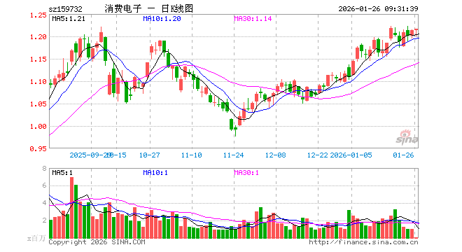 1月26日,消费电子ETF(159732)开盘跌0.08%,报1.213元。消费电子ETF(159732)重仓股方面,立讯精密开盘跌0.22%,胜宏科技涨1.03%,京东方A涨0.67%,兆易创新涨0.93%,东山精密跌0.14%,豪威集团涨0.00%,TCL科技涨0.20%,歌尔股份跌0.48%,蓝思科技跌1.17%,三环集团涨0.02%。