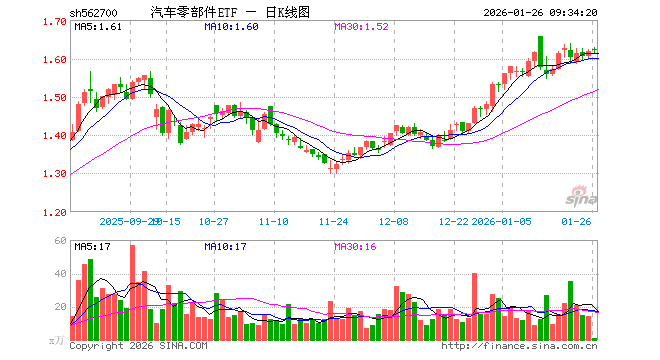 1月26日,汽车零部件ETF(562700)开盘涨0.25%,报1.623元。汽车零部件ETF(562700)重仓股方面,汇川技术开盘涨0.15%,三花智控涨0.00%,福耀玻璃涨0.08%,拓普集团涨0.69%,长盈精密涨2.49%,赛轮轮胎涨0.13%,德赛西威跌0.47%,双环传动涨1.12%,银轮股份跌0.42%,华域汽车涨0.00%。