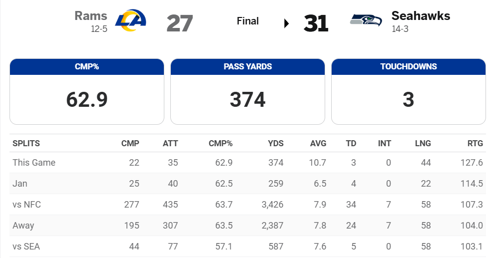 全场比赛,公羊四分卫马修-斯塔福德传球35次完成22次,传球374码,传球成功率62.9%,贡献3次达阵,0次被抄截,四分卫评分为127.6。