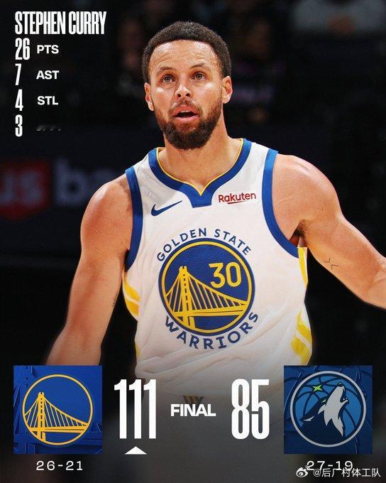 勇士战胜森林狼库里升至历史得分榜第19位 今日勇士111-85客场大胜森林狼终结自己的两连败,勇士虽半场落后1分,但在第三节打出冲击波将比分拉开至20分,最终赢下比赛。今日库里依旧发挥稳定,得到26分2板7助4断、穆迪19分8板2助2帽,森林狼方面爱德华兹空砍32分。而库里今日的出色表现让他的生涯得分来到了26397分,超越了哈弗里切克,与皮尔斯并列升至历史第19位。