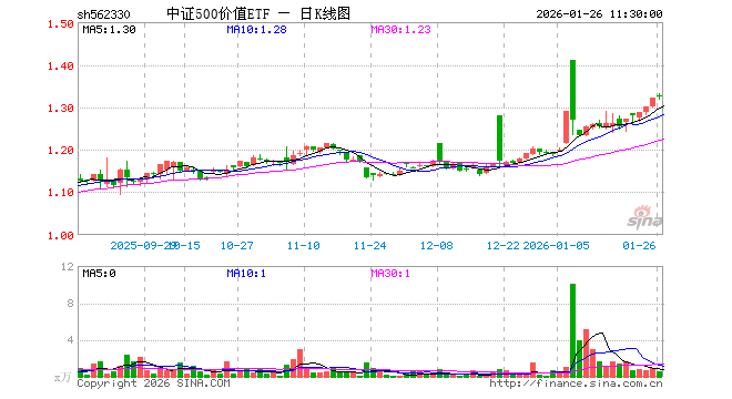 1月26日,截止午间收盘,中证500价值ETF(562330)涨0.53%,报1.328元,成交额79.41万元。中证500价值ETF(562330)重仓股方面,金风科技截止午盘跌1.72%,西部矿业涨9.61%,厦门钨业涨6.92%,天山铝业涨1.67%,杰瑞股份涨2.38%,神火股份涨4.64%,云天化涨2.52%,苏州银行跌0.12%,东吴证券涨1.81%,永泰能源涨0.00%。