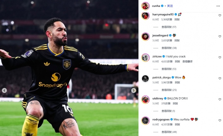直播吧1月26日讯在库尼亚庆祝曼联击败阿森纳的社媒评论区,曼联旧将林加德现身。