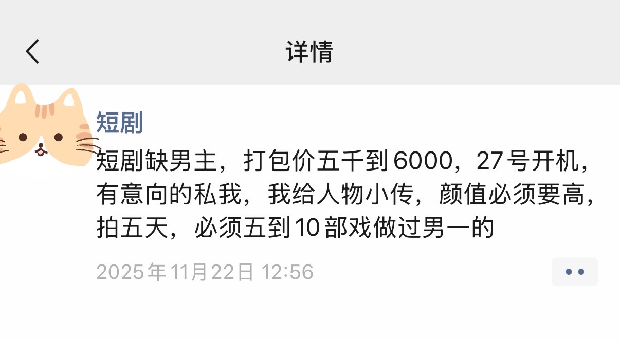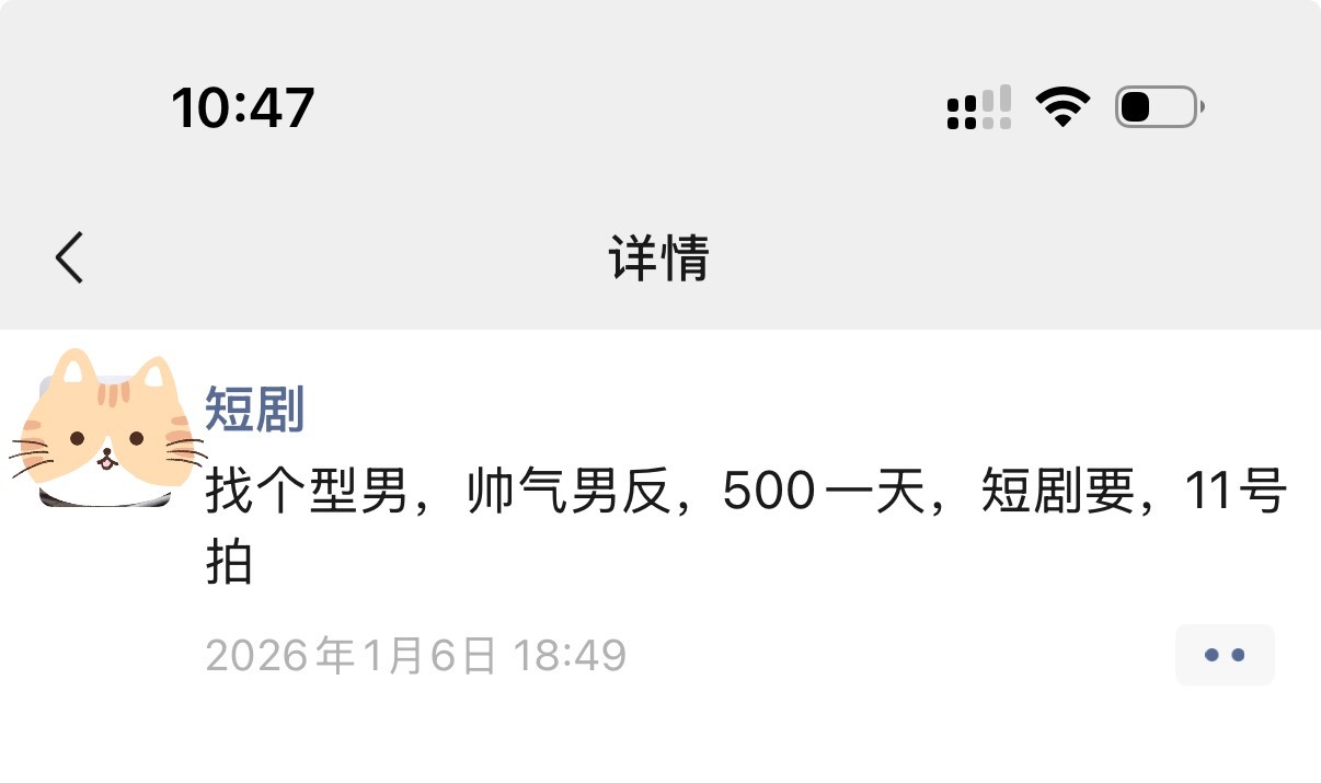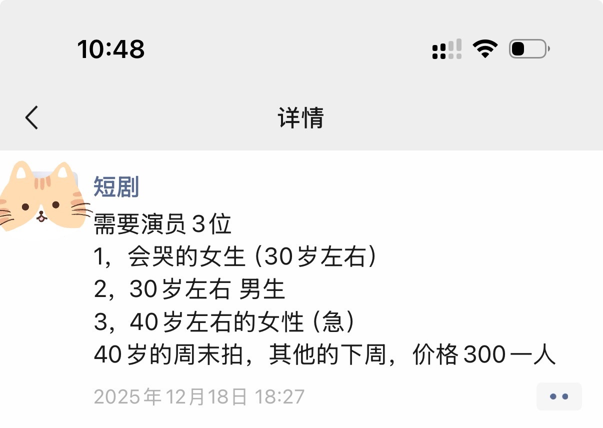 短剧女主全年无休拍了48部戏就我微信上一个满是短剧通告的朋友圈来看演员需求量确实蛮大的短剧群演的价格也不高甚至有的男一女一也才一天1000 工作时间不用说,也是超长续航