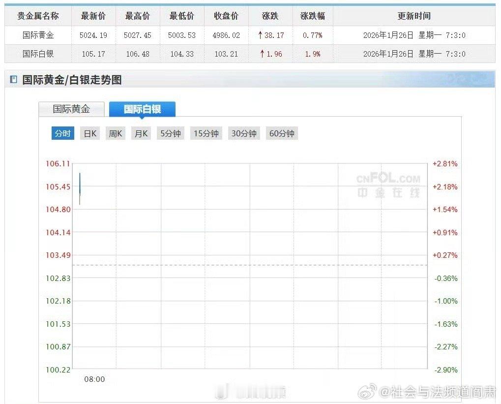 阎肃观察肃言肃语 【现货黄金突破5000美元国际金价疯涨原因】1月26日,现货黄金历史首次突破5000美元/盎司整数大关,距离其首次突破4000美元关口(2025年10月8日)仅过去100余日。从金价上涨原因来看,去年,在美国宽松货币政策、各国央行购金以及ETF资金流入创纪录等因素推动下,黄金价格上涨逾64%。今年,市场普遍认为,在地缘政治紧张局势加剧的背景下,未来金融和地缘政治的不确定性上升,投资者纷纷寻求避险资产。独立分析师罗斯·诺曼表示:“我们预测,今年黄金价格将达到每盎司6400美元的高点,均价为每盎司5375美元。”(综合金十数据、中国基金报)现货白银突破106美元
