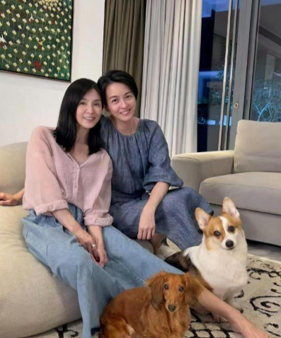 49岁梁咏琪现身新加坡,到好友杨采妮家里做客。杨采妮脸部素颜,一头长发乌黑发亮,