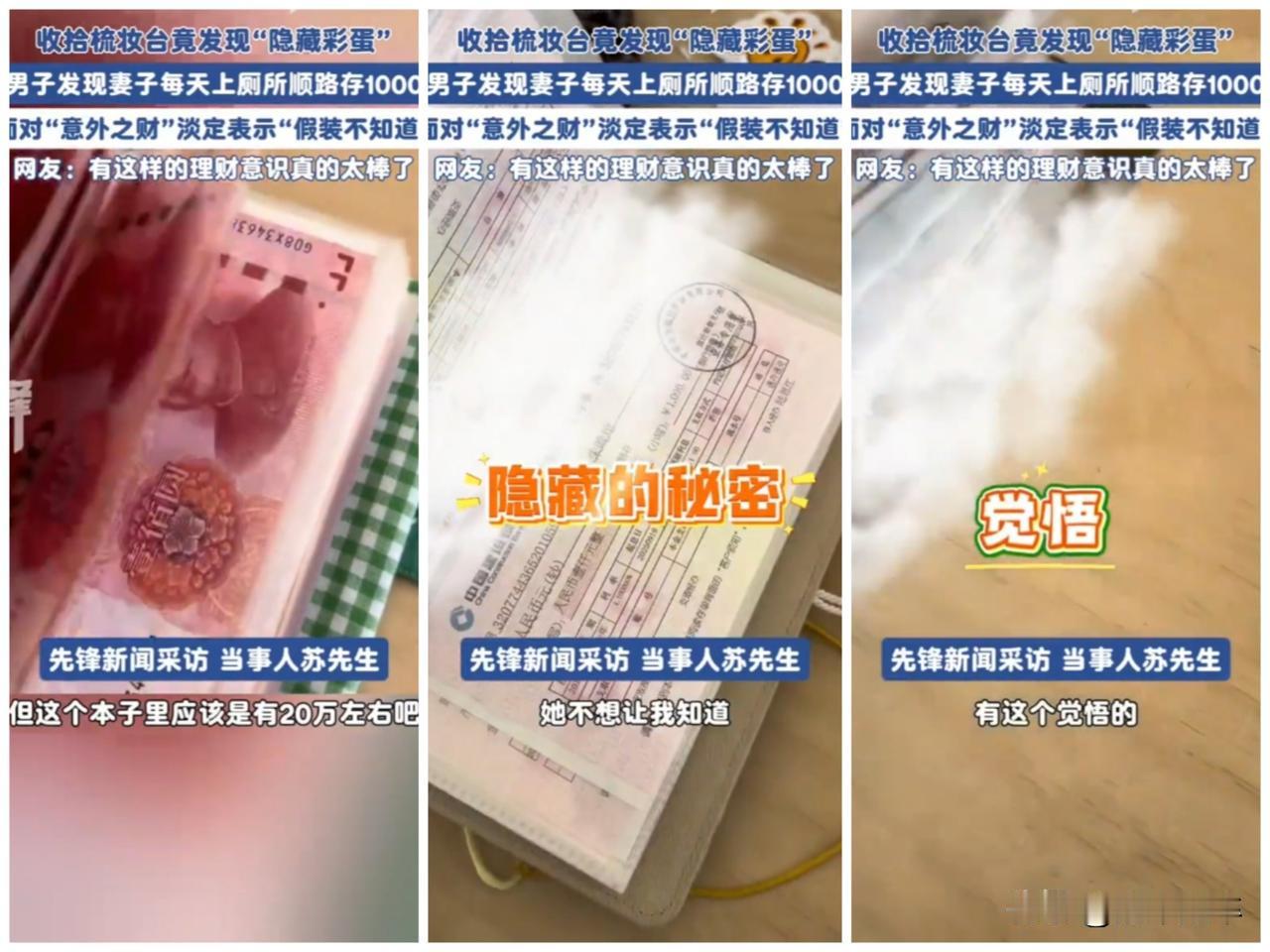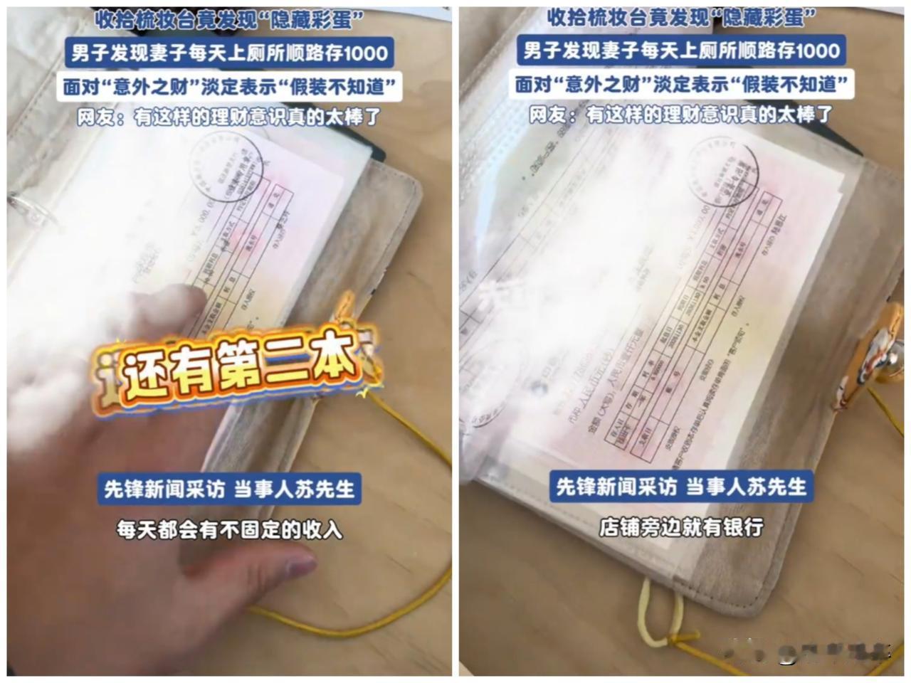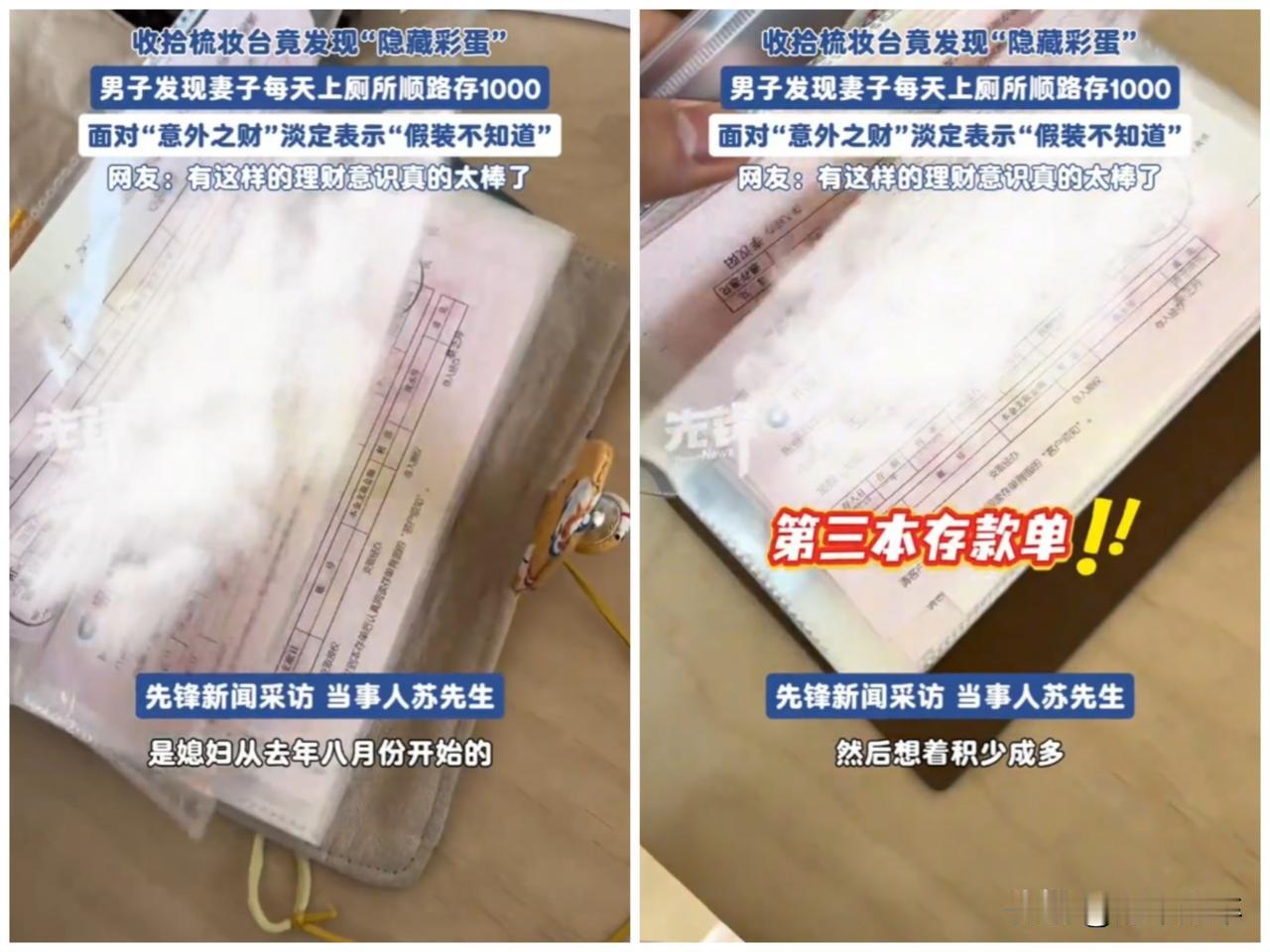 这样的老婆堪称贤妻👍她不想让我知道,我就让全网知道😂 夫妻均为个体户,收入按日结算。妻子自25年8月起,每日以上厕所为由前往店铺隔壁银行存入1000元现金,持续至26年1月23日,累计约200张存单总额20万元。存单被丈夫苏先生大扫除时意外发现于记事本中。妻子称此举是为避免现金随手花掉,为家庭储备应急资金。 这个老公挺有意思的,口口声声说“她不想让我知道,那我就不问,咱有这觉悟”。转身就把事情给挂网上了,让全国人民都知道的。那确实是“相当”有觉悟了🤭。妻子存钱是积极行为,丈夫若真尊重妻子,或许私下沟通分享喜悦更好,而非将隐私公之于众,能避免一些亲友借款的麻烦。 如今年轻人多热衷提前消费,妻子能坚持每日存1000元,半年攒下20万这份自律和规划意识着实难。为家庭构筑了坚实的“安全垫”,值得点赞。妻子176天坚持证明财富积累未必依赖高收入,而在于将微小习惯持之以恒。存钱储蓄确实是给生活兜底,尤其在经济波动期更显重要。 夫妻财务不用完全透明到“查岗式”,但也别藏着掖着。可以搞三层账户体系设立共同账户(家庭开支)、联名目标账户(购房/教育)、个人账户(小额自主支配),既留私人空间,也不影响家庭规划。低利率时代,存钱的自律比啥都强。当然了这些计划也要有经济保险作为基础,日均千元储蓄依赖高收入背景(推测月入超3万元)非普适方案(我存100都困难)。这里我先酸为敬🍋🍋🍋 顾家的好老婆 通情达理的妻子